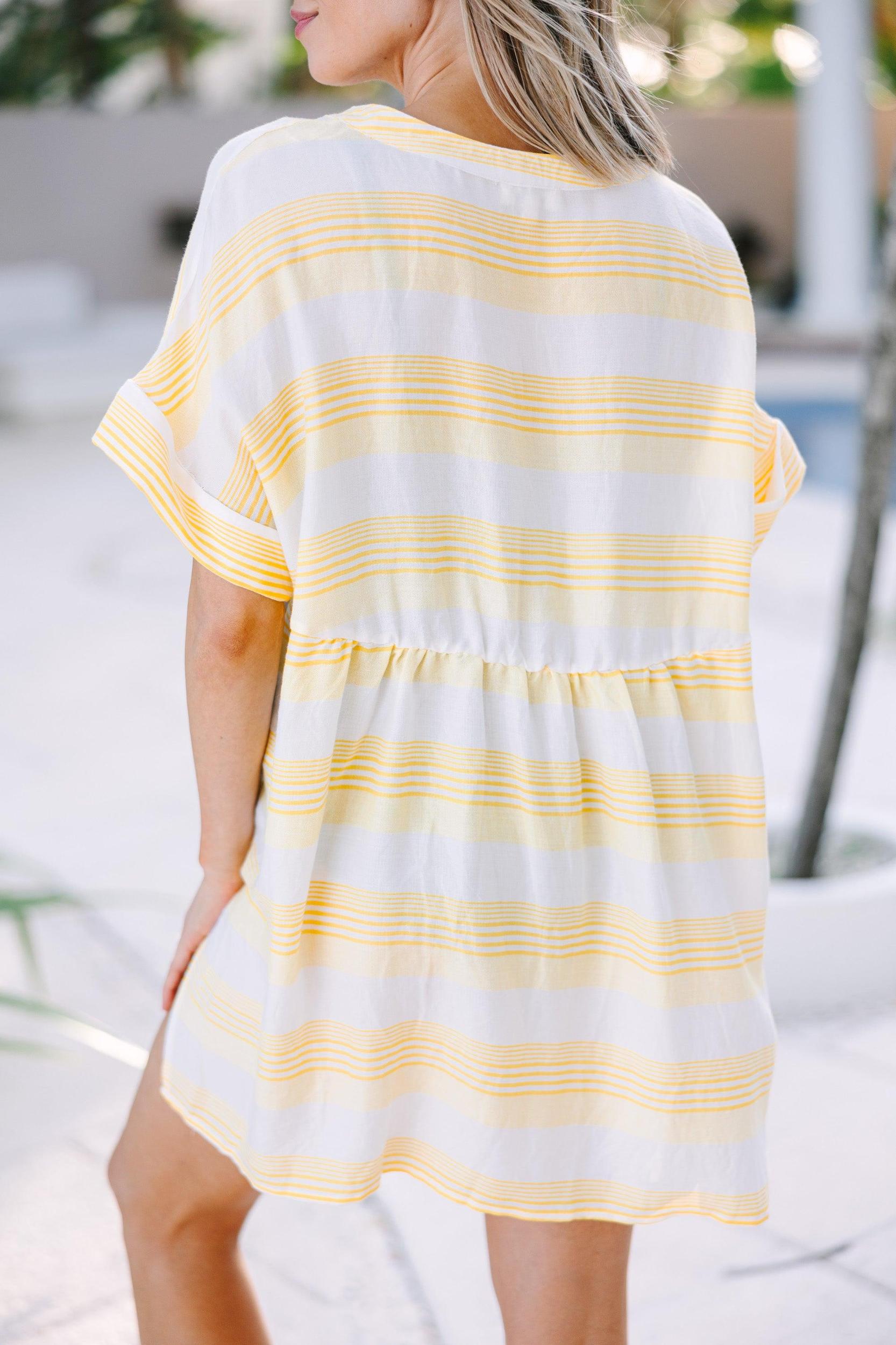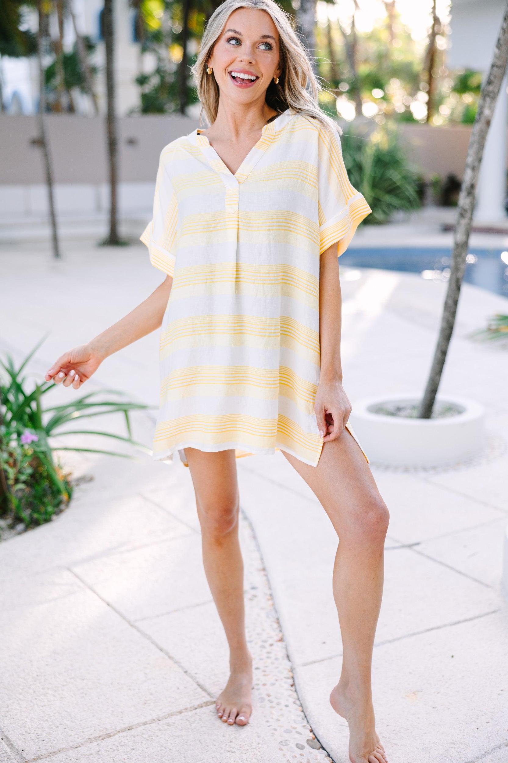 Feel confidently stylish in the Follow The Rules Yellow Striped Cover-Up. This fun tunic features chic yellow stripes and light fabric for a look that's comfortable and fashionable. Forego boring cover-ups in favor of this eye-catching cover-up! V-neckline Short, cuffed sleeves Striped print No stretch Cam is wearing the small.