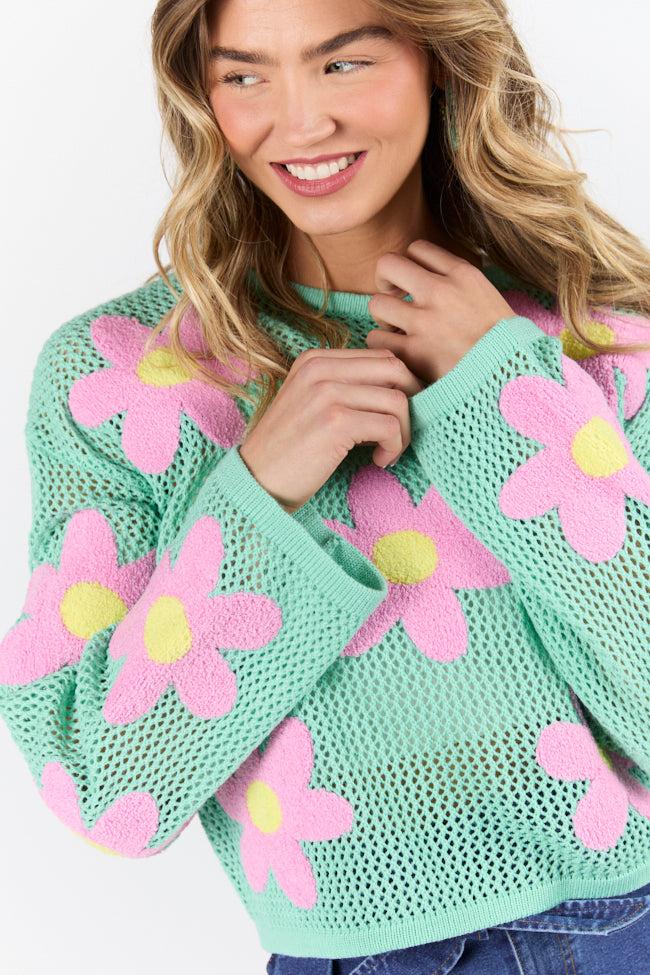 Details Mint And Pink Flower Embroidered Sweater Fabric has some stretch Embroidered flowers, relaxed fit, crew neckline Pair this with a cute skort! Unlined Size small from shoulder to hem: 21" Material and Care 100% acrylic Machine wash cold, tumble dry low Patterns may vary Materials may have natural variations Colors may vary from different viewing devices