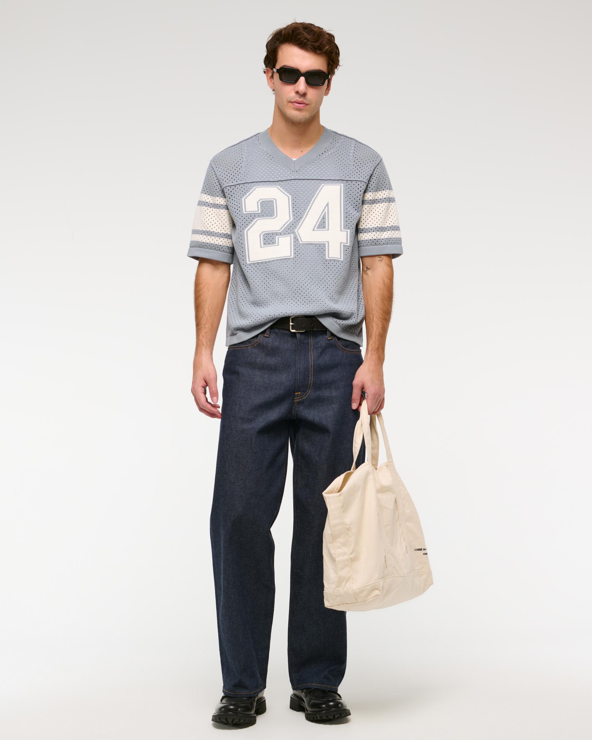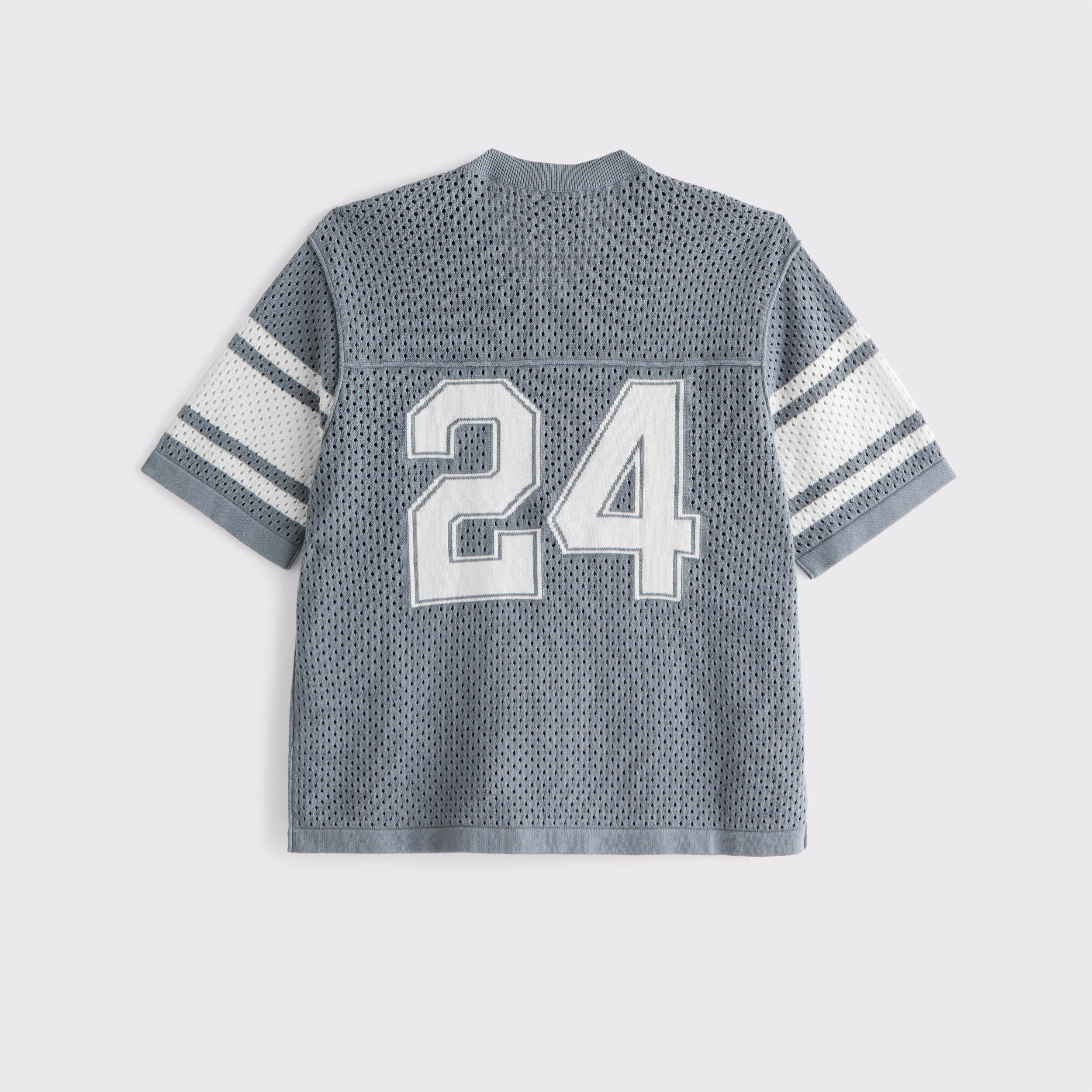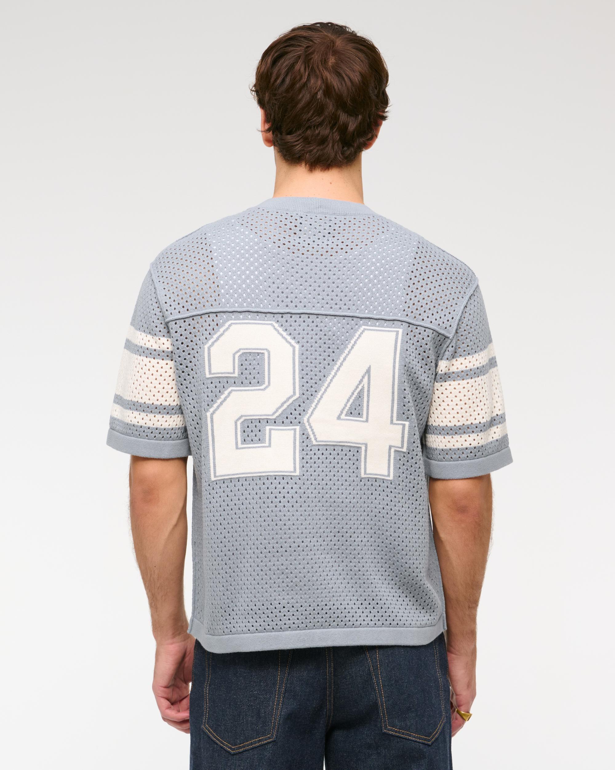 Comfortable short-sleeve football jersey-inspired sweater in our soft sweater-knit fabric and oversized-fit silhouette, featuring a slightly cropped body length, sporty graphic details at chest and back, varsity-inspired stripes along the sleeves, v-neckline and banded hem and cuffs.