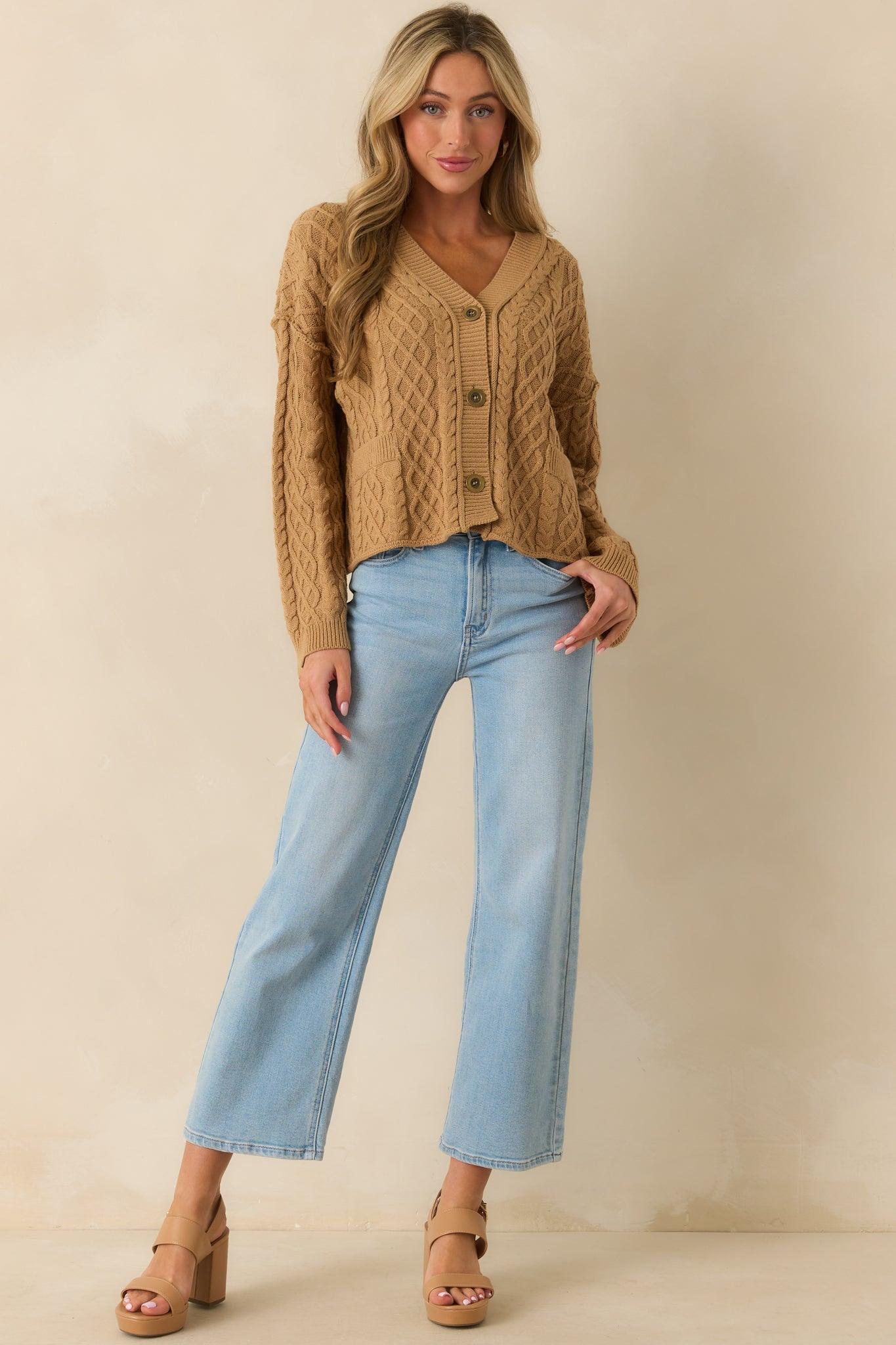 The For Old Time’s Sake Camel Brown Cable Knit Button Up Cardigan brings back that timeless, cozy charm you can count on, making every outfit feel warm, classic, and effortlessly stylish. This camel brown cardigan features a cable knit design, v-neckline, functional button front, faux front patch pockets, long sleeves, ribbed hems, and a relaxed fit. 60% Cotton & 40% Acrylic Unlined Hand Wash Cold Manufactured in China Designed in The USA Model is 5'8" and is Wearing a Size Small