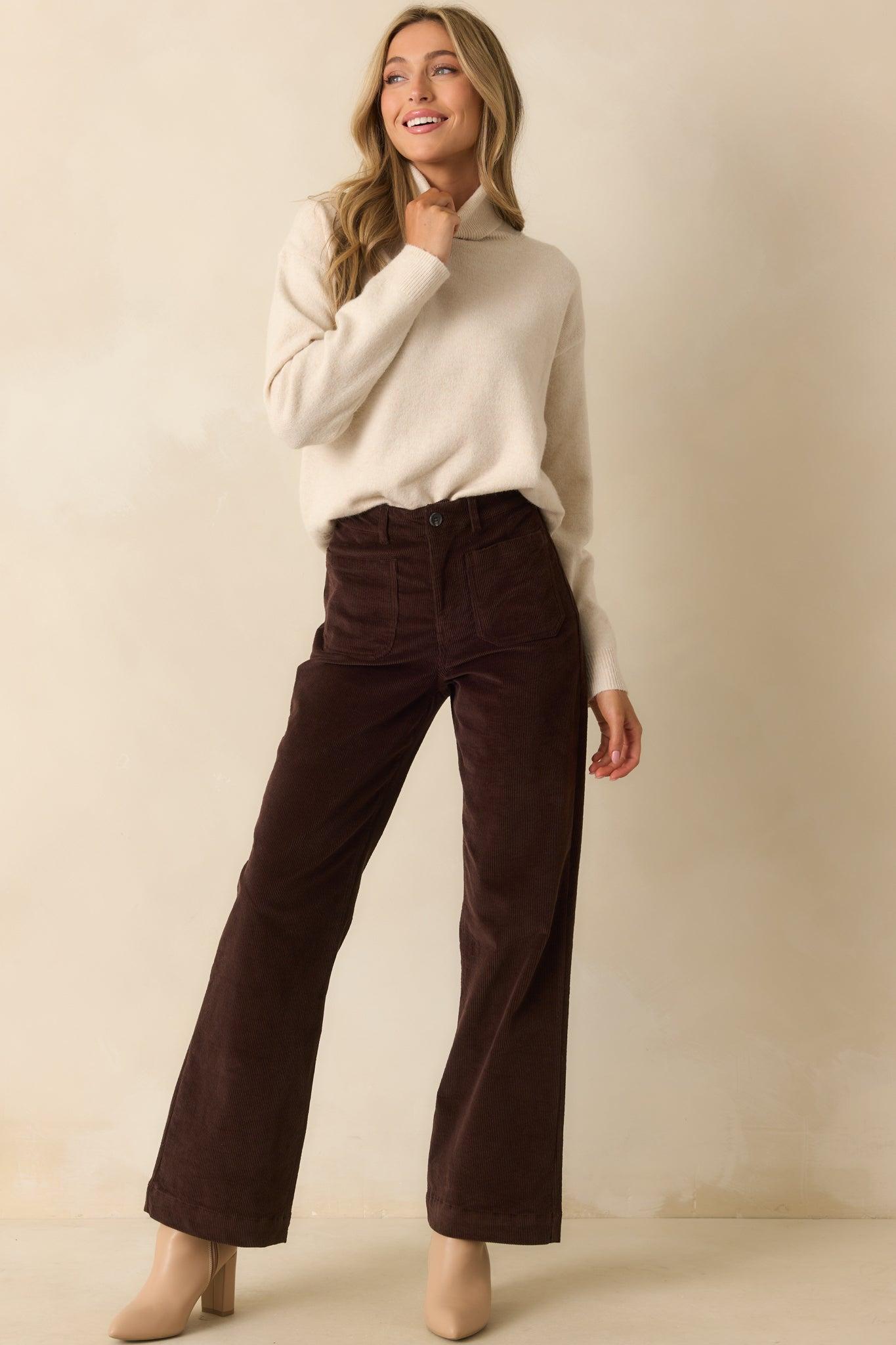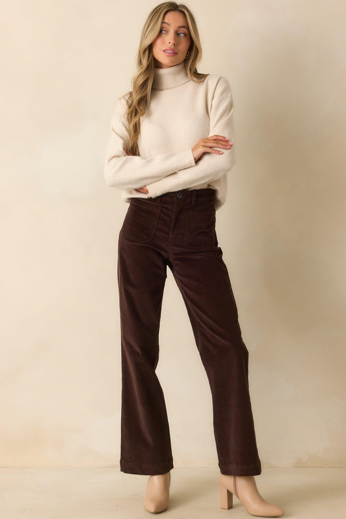The For The Best Light Beige Knit Long Sleeve Turtleneck Sweater is always the right choice, bringing a classic feel that keeps you looking your best without even trying. This light beige sweater features a classic fold-over turtleneck collar, long sleeves, ribbed knit trim at the neckline, cuffs, and hem, and a relaxed silhouette. 50% Recycled Polyester, 15% Polyester, 13% Nylon, 13% Acrylic, 6% Wool, & 3% Spandex Unlined Machine Wash Warm Manufactured in China Designed in The USA Model is 5'8" and Wearing a Size Small