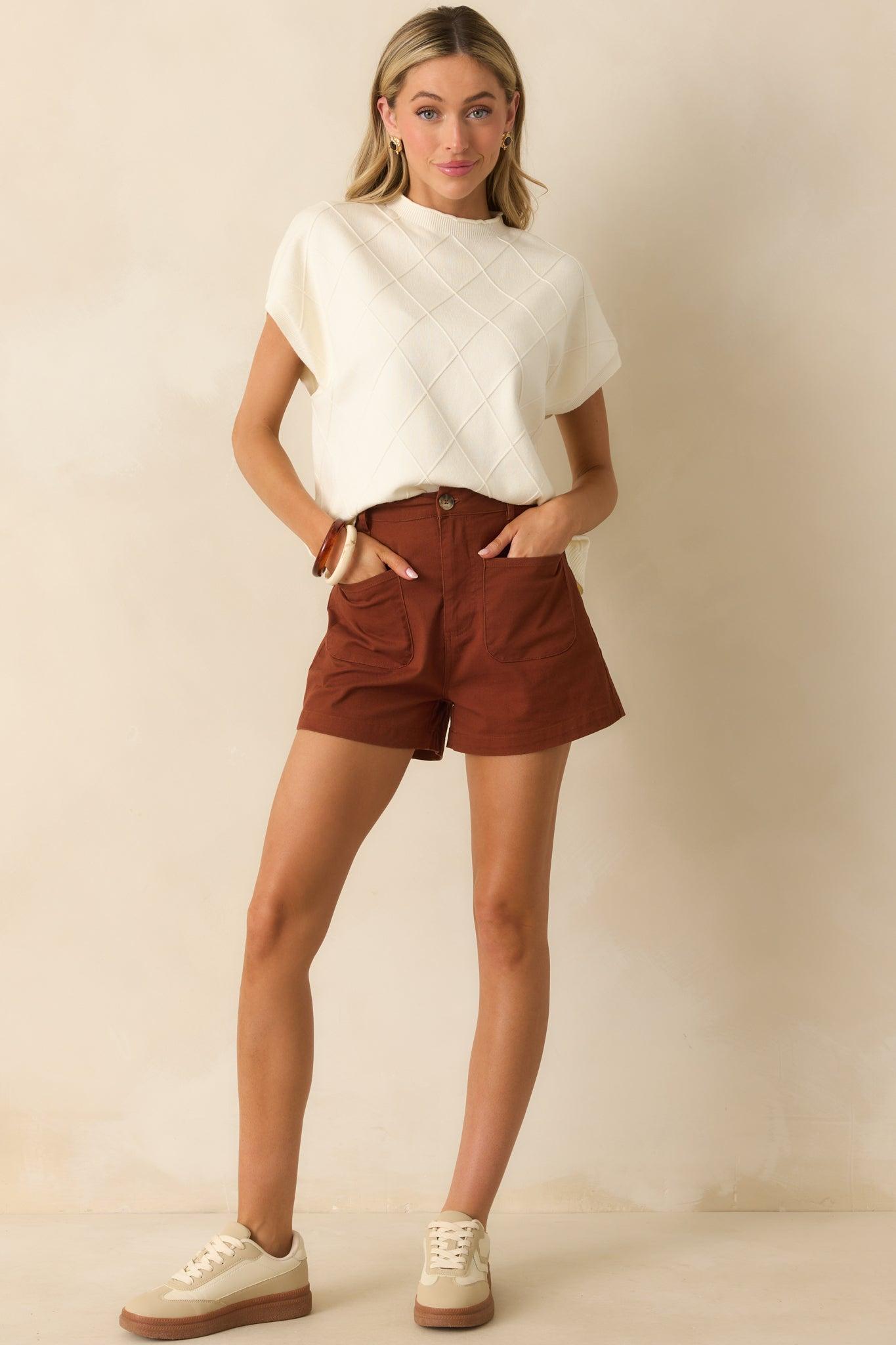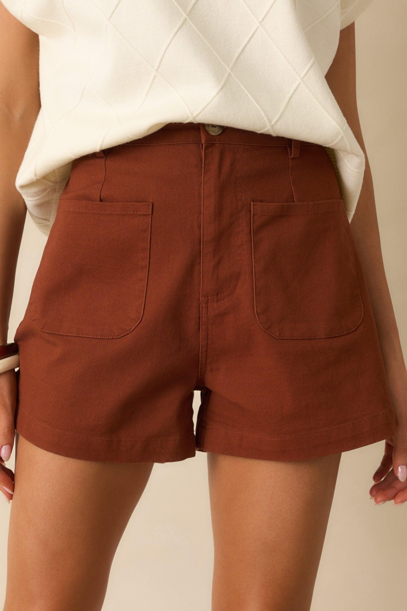 The For The Moment Cinnamon Brown Cotton High Waisted Patch Pocket Shorts are for when you want to keep things simple and feel good doing it. Clean, comfortable, and quietly confident—they’re the kind of piece that fits in without fading out. These cinnamon brown shorts feature a high waisted design, zipper and button closure with a tortoise shell button, functional front patch pockets, functional belt loops, and non-functional back slit pockets.