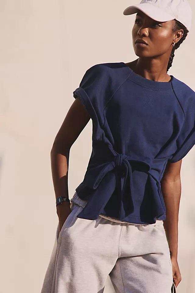 **Features:** Scoop neckline; dropped shoulders; defined short sleeves; sweatshirt-inspired fabrication; defined tie detail at waist