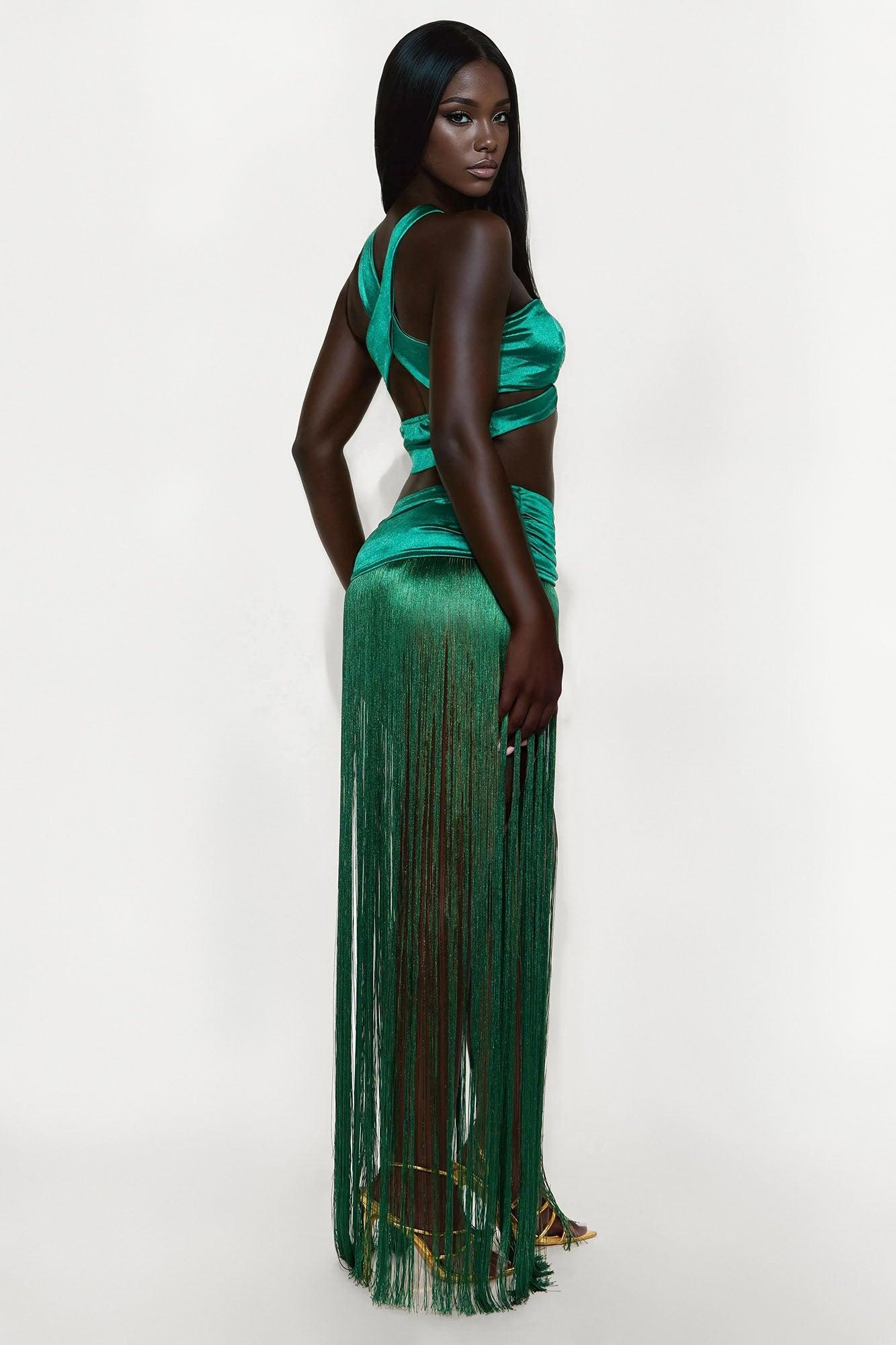 Forbidden Fringe Satin Maxi Skirt Set - Emerald