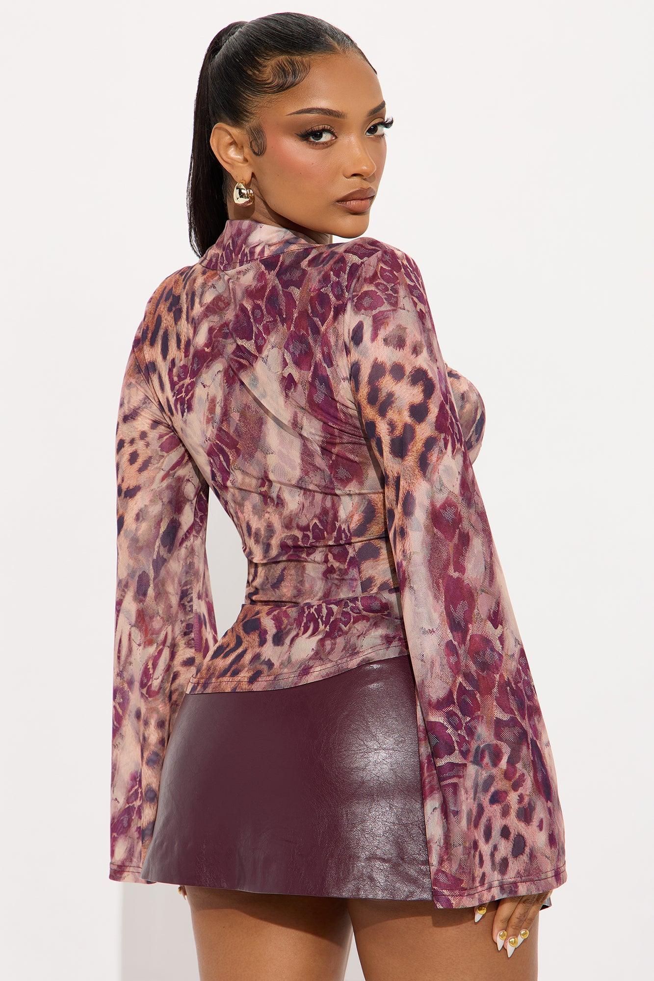Available In Brown/combo. Mesh Top Collar Long Sleeve Lace Up Chain Strap Ruched Stretch Disclaimer: Print Placement May Vary Self: 95% Polyester 5% Spandex Imported California Proposition 65WARNING: Cancer and Reproductive Harm - www.P65Warnings.ca.gov.