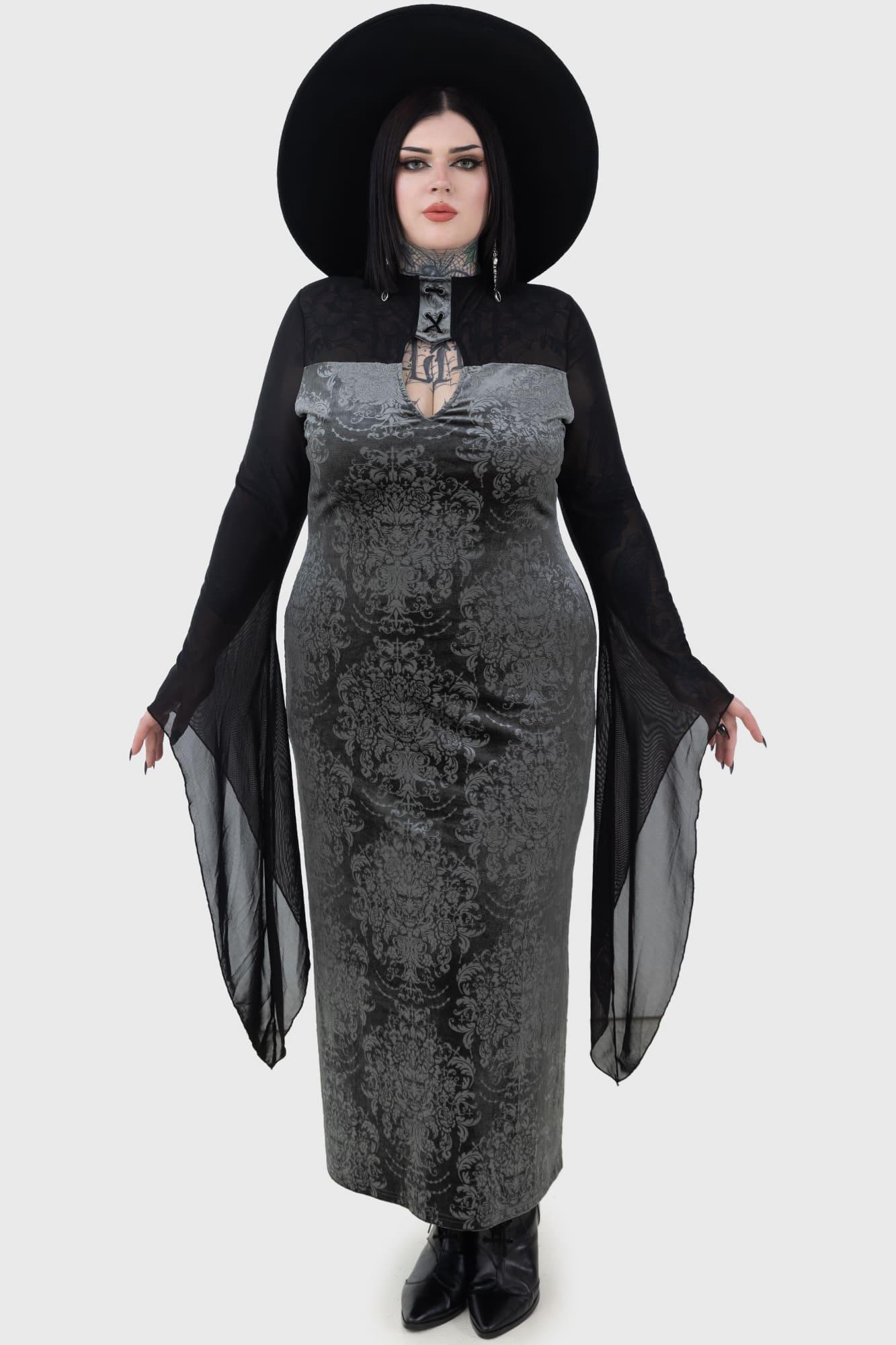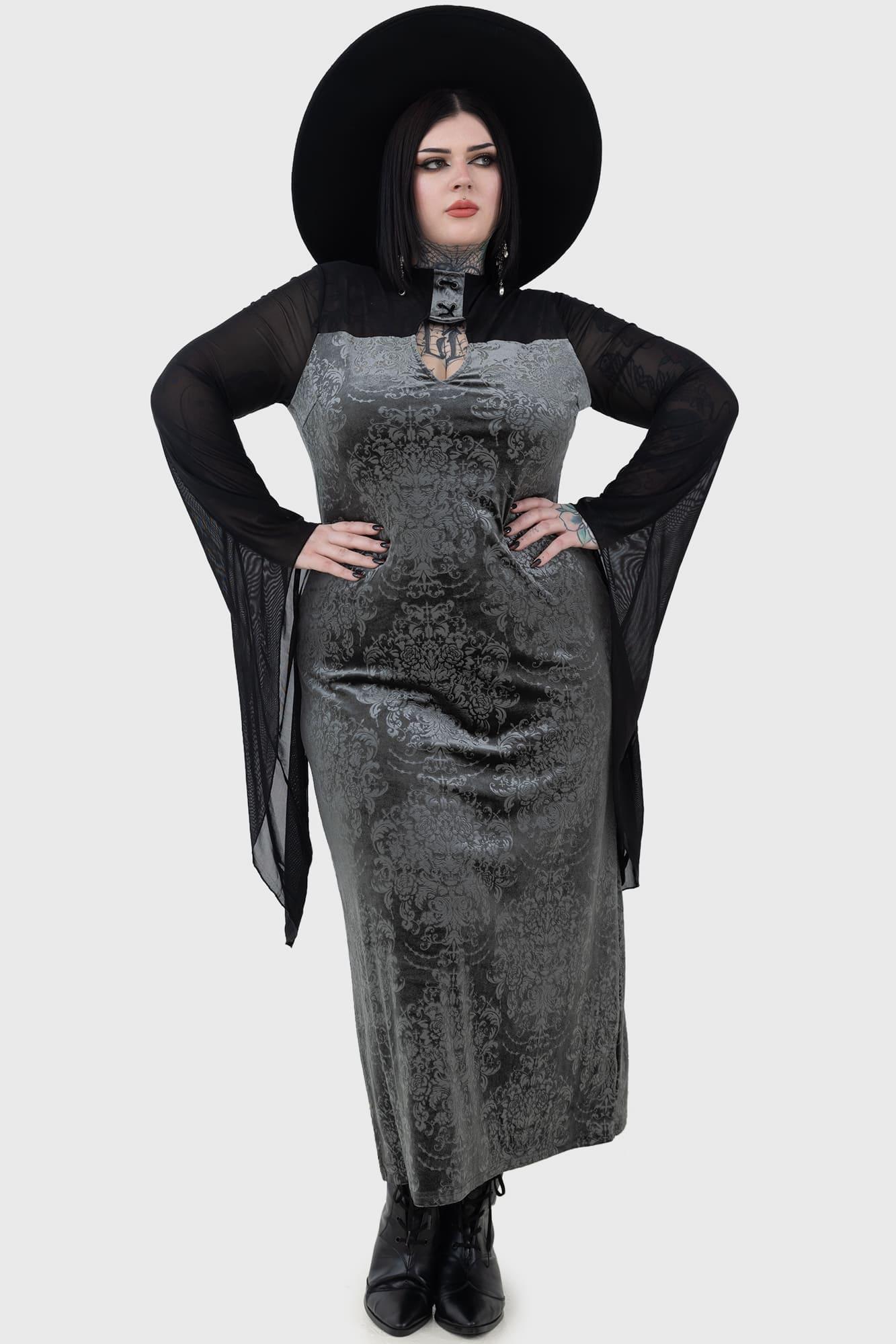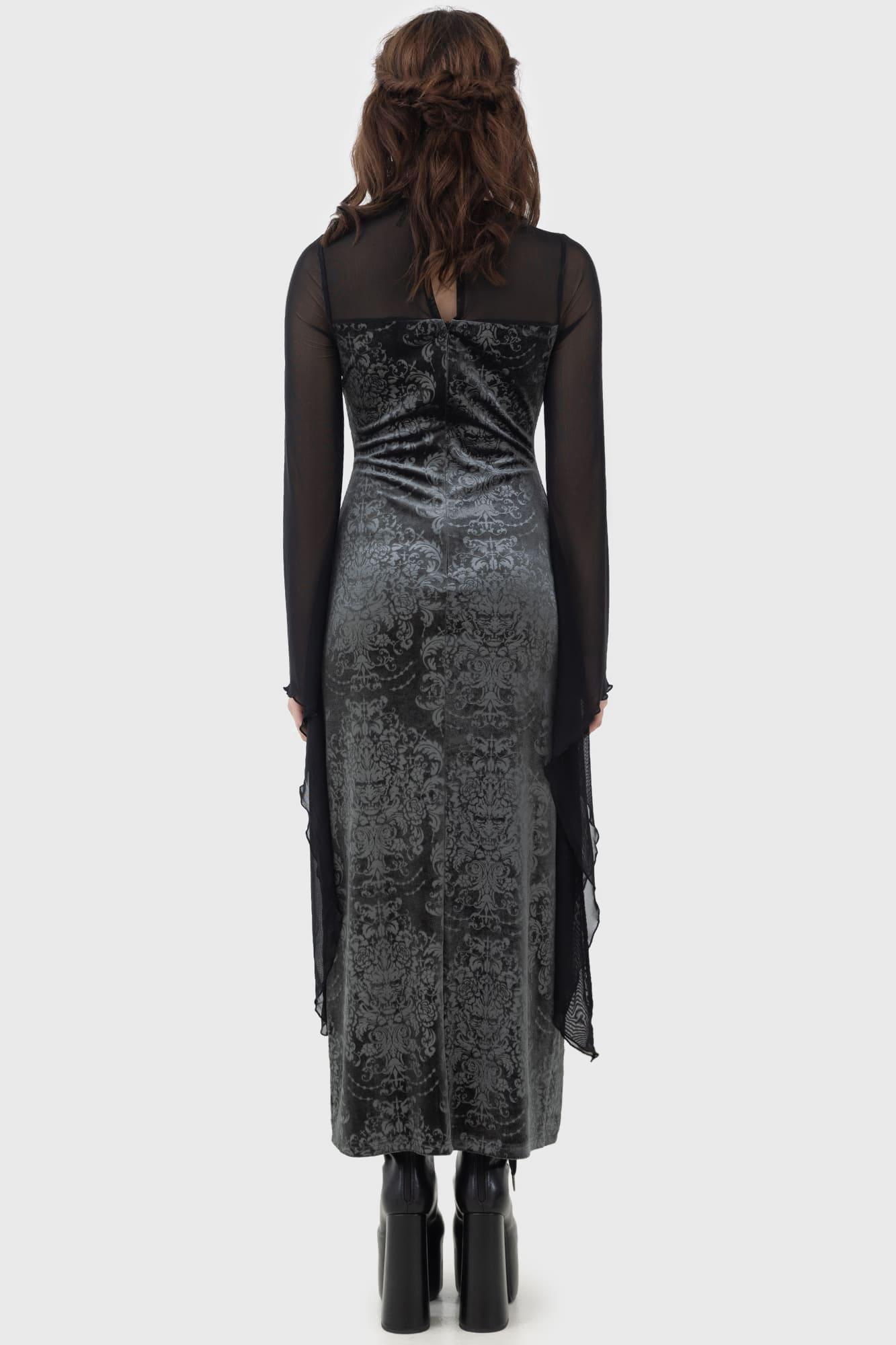 FORENOON.- Embossed metallic velvet.- Fiendish artwork.- Long draped sleeves.- Maxi length.- Keyhole detail.- Back zip closure.- Fitted.With KILLSTAR branding, Main body: 93% Polyester 7% Elastane, Sleeves: 95% Polyester 5% Elastane.Machine wash cold (30°c) / Do not bleach / Do not tumble dry / Do not Iron / Do not dry clean. Imported.