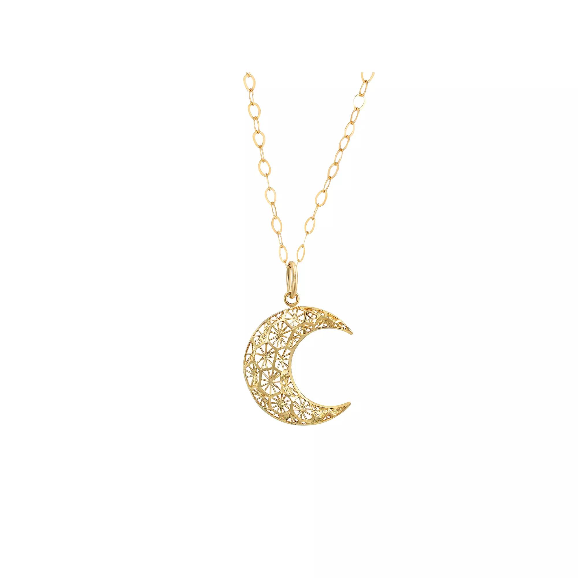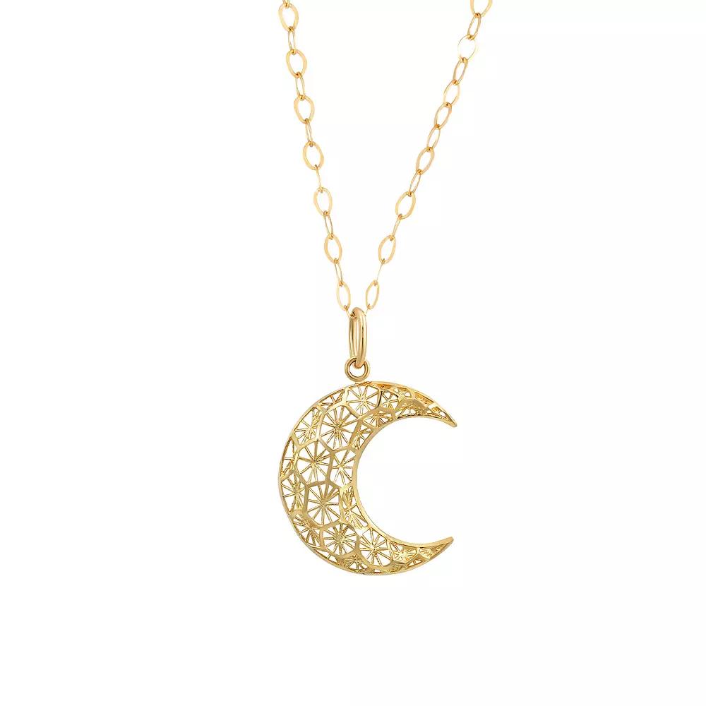 Enhance your celestial style with this Forever 14k Gold Textured Filigree Moon Pendant Necklace. Its delicate filigree detailing and rich gold finish create a timeless and elegant look. Click on this JEWELRY & WATCHES GUIDE to learn about fit, styles, materials and more! Enhance your celestial style with this Forever 14k Gold Textured Filigree Moon Pendant Necklace. Its delicate filigree detailing and rich gold finish create a timeless and elegant look. Click on this JEWELRY & WATCHES GUIDE to learn about fit, styles, materials and more! FEATURES Dimensions: 1.02"L x 0.69"W Chain length: 18 in. Chain type: cable Clasp: spring-ring Nickel free Metal: 14k gold Finish: diamond-cut Size: 18". Gender: female. Age Group: adult.