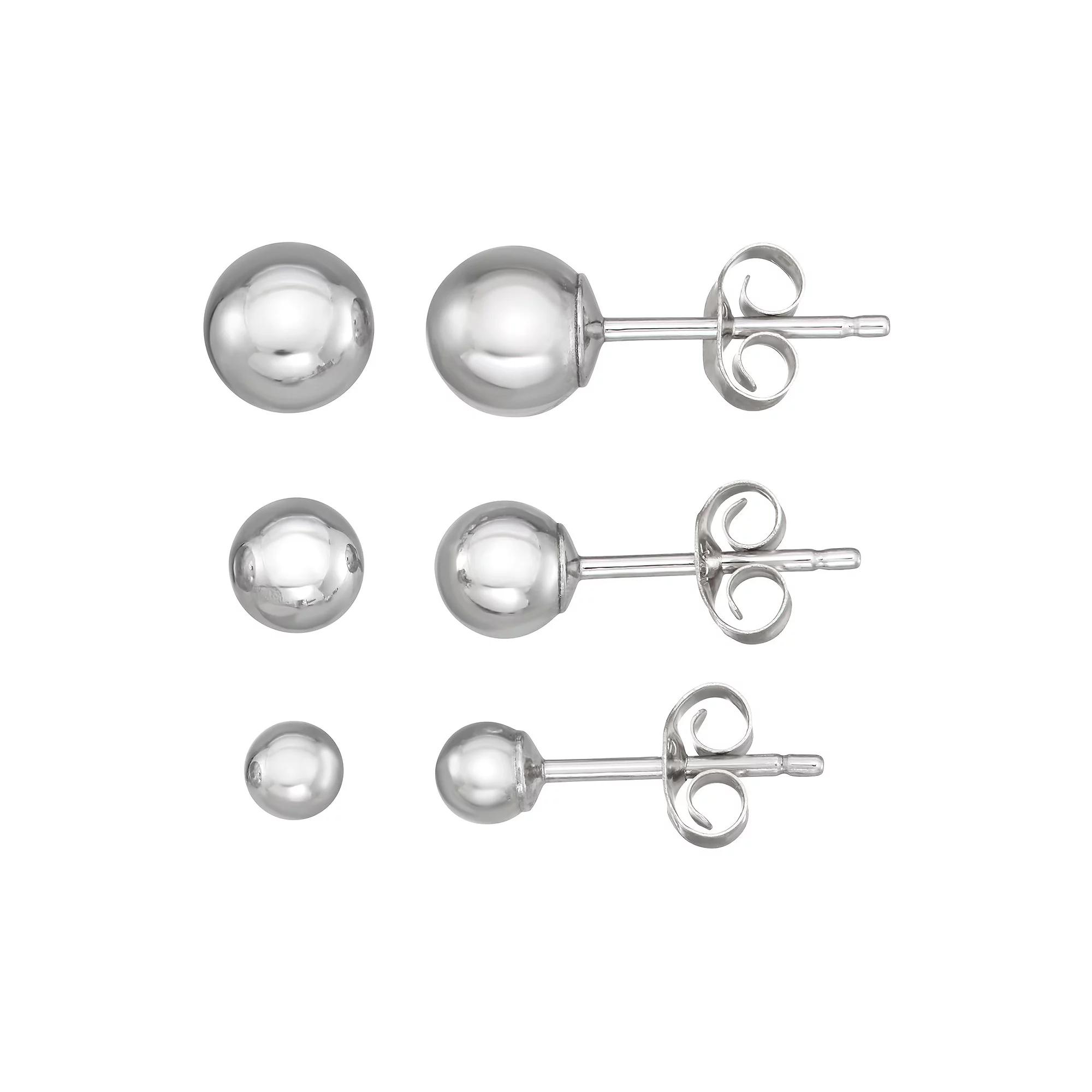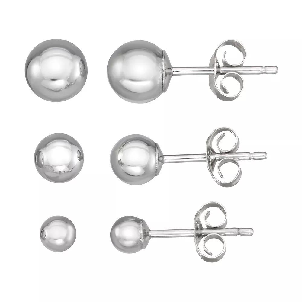 Elegant style starts with this graduated ball earring set from Forever 14K. Elegant style starts with this graduated ball earring set from Forever 14K. Set includes: 3 pairs of earrings Length: 4 mm, 5 mm, 6 mm Backings: post Metal: 14k white gold Plating: rhodium Finish: polished Nickel free Packaging: boxed Image(s) may be enlarged to show detail. Size: One Size. Color: Silver. Gender: female. Age Group: adult.