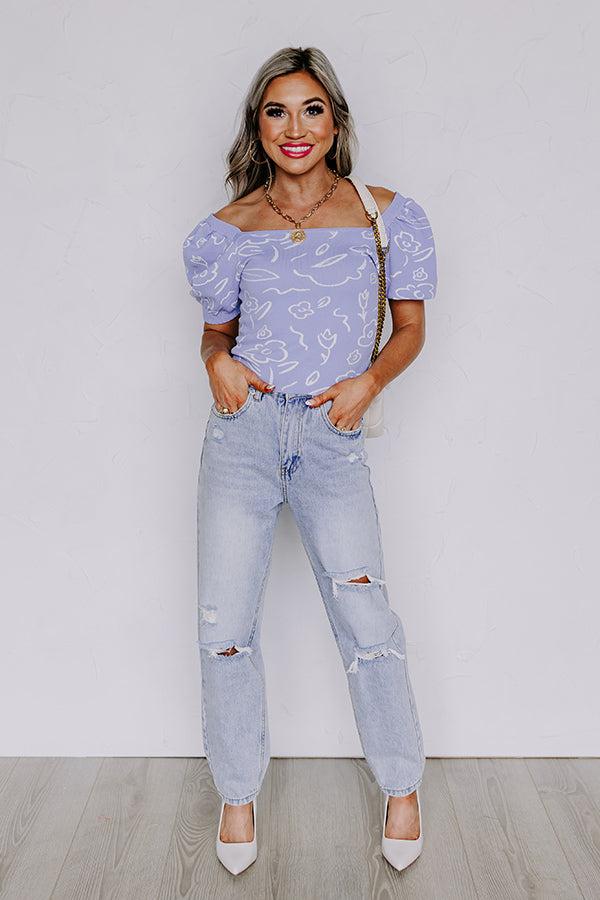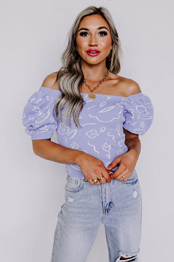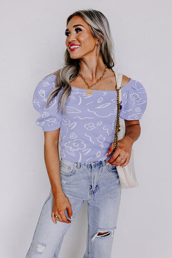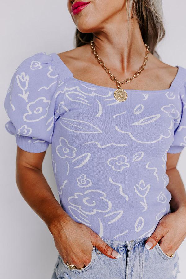 - Everyone will admire you in this beautiful new top! - Tight knit, serenity colored material with an abstract floral design - Square neckline - Short puff sleeves - Figure flattering silhouette that ends in a straight hemline