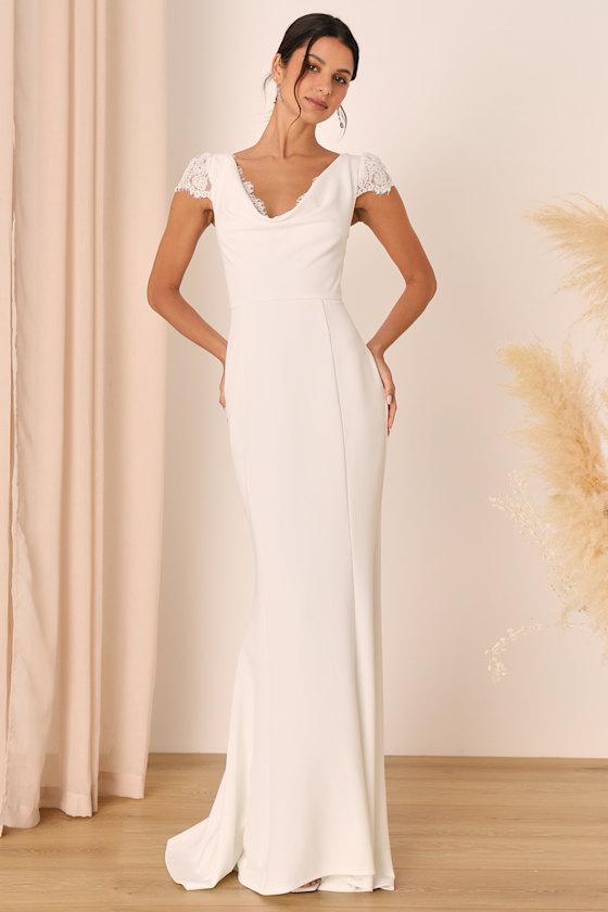 There's no feeling like finding the perfect dress, so Lulus brought you the Lulus Forever Beloved White Lace Cap Sleeve Mermaid Maxi Dress! Stretchy techno-crepe knit fabric shapes this striking dress that has sheer cap sleeves made from eyelash lace and a deep V-back with matching trim. Bodice has an elegant cowl neckline —with peekaboo lace insert—and a high, fitted waist. Skirt has a mermaid silhouette as it falls to a sweeping maxi hem. Hidden zipper/clasp at back.