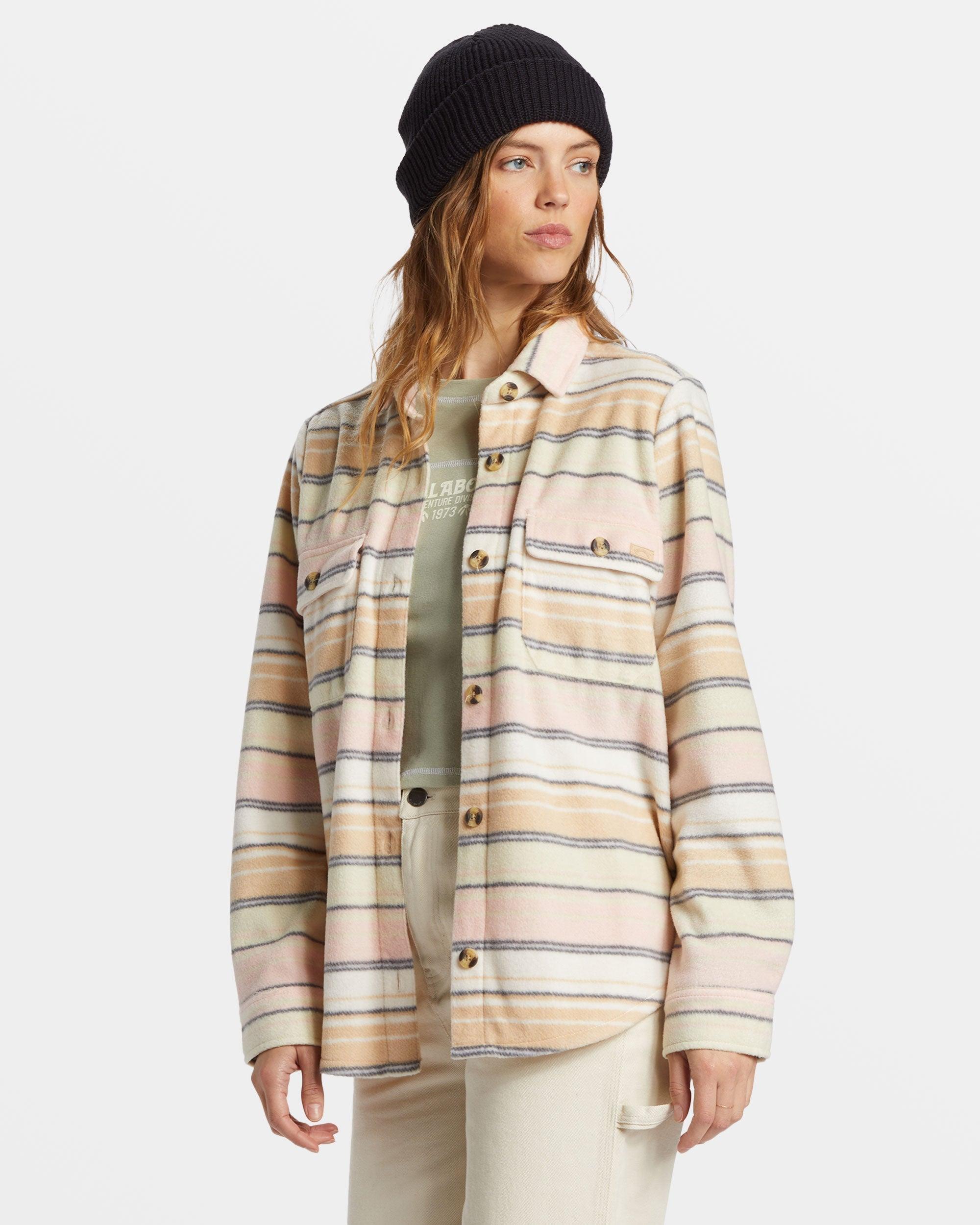 Billabong's Forge Fleece Shaket from the Adventure Division Collection combines comfort, warmth, and style suited for the great outdoors. Crafted from partially recycled polyester fabric for a cozy, fleece feel, this oversized sweater-jacket offers a relaxed fit with a collar neck, chest flap pockets, and front buttons. Topped with a durable, water-repellent finish to keep you warm and dry. Featured here in the Mountain Rose colorway.Features Collection: Adventure Division collection Fabric: Partially recycled polyester fabric Waterproofing: Durable Water Repellent [DWR] fabric treatment to keep you dry and protected from the elements Fit: Relaxed fit Neck: Collar neck Sleeves: Long sleeves Length: 28.75" hps (Size M) Closure: Button up closure Pockets: Chest flap pockets Branding: Metal plate Other Features: Rib neckband and sleeve cuffs Sizing: This product follows junior sizing, check the size chart for your perfect fit.