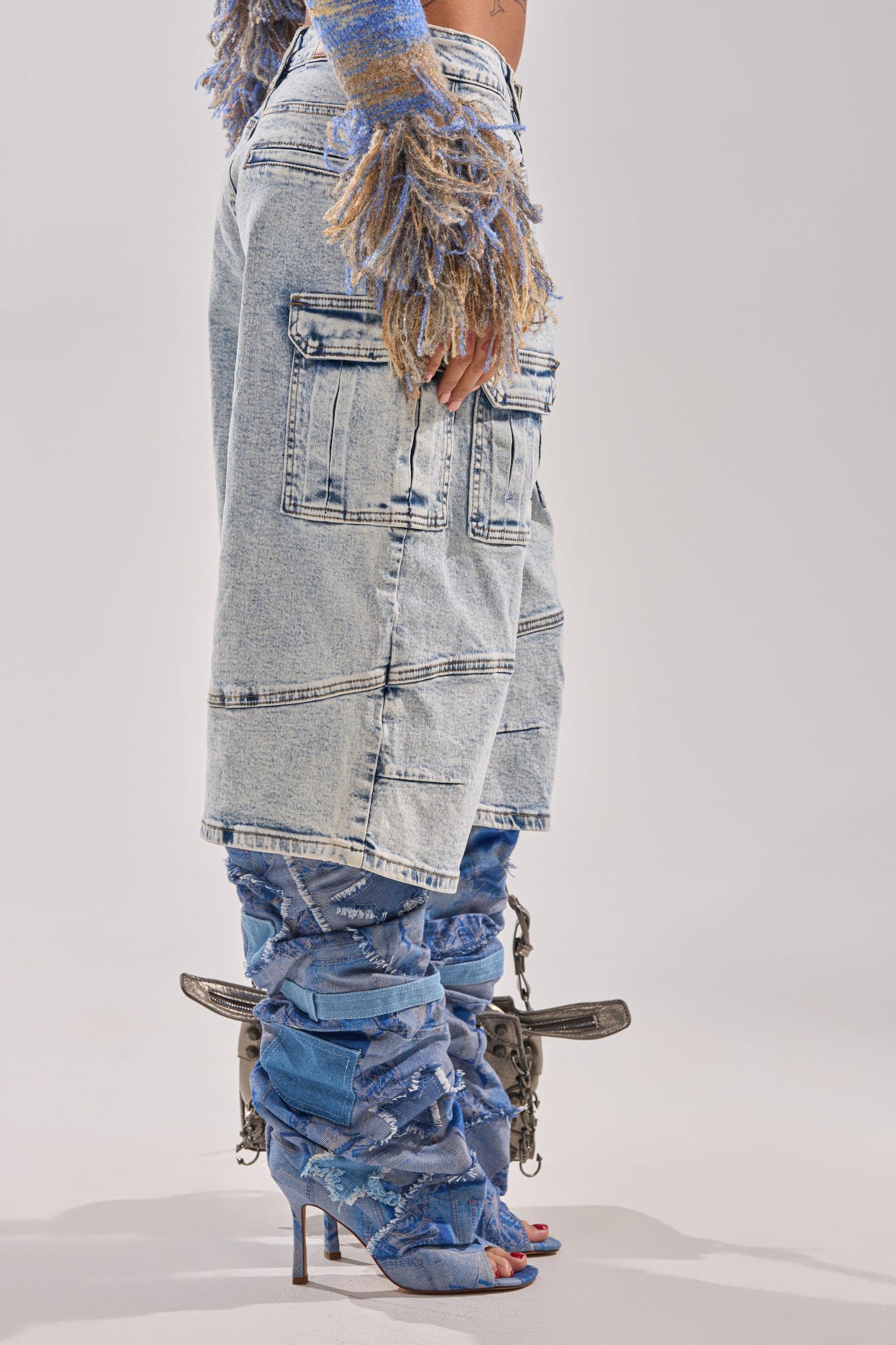 Acid-wash, semi-stretch denim with a classic bermuda silhouette and cargo-inspired detailing. It features a high-rise fit, functional belt loops, a classic five-pocket design with additional cargo-style pockets lining the upper thighs, and reinforced seam paneling. Complete with a classic front zip fly with a button closure. Style with a baby tee and platform sneakers to elevate your casual days. - 99% Cotton 1% Spandex- Slight Stretch- Imported (all measurements approximate from size 26)- 11” Rise- 16” Inseam- Model is 5’7” and is wearing size 26)Product ID: 1076239 (all measurements approximate from size 33)- 11” Rise- 16” InseamProduct ID: 1076246