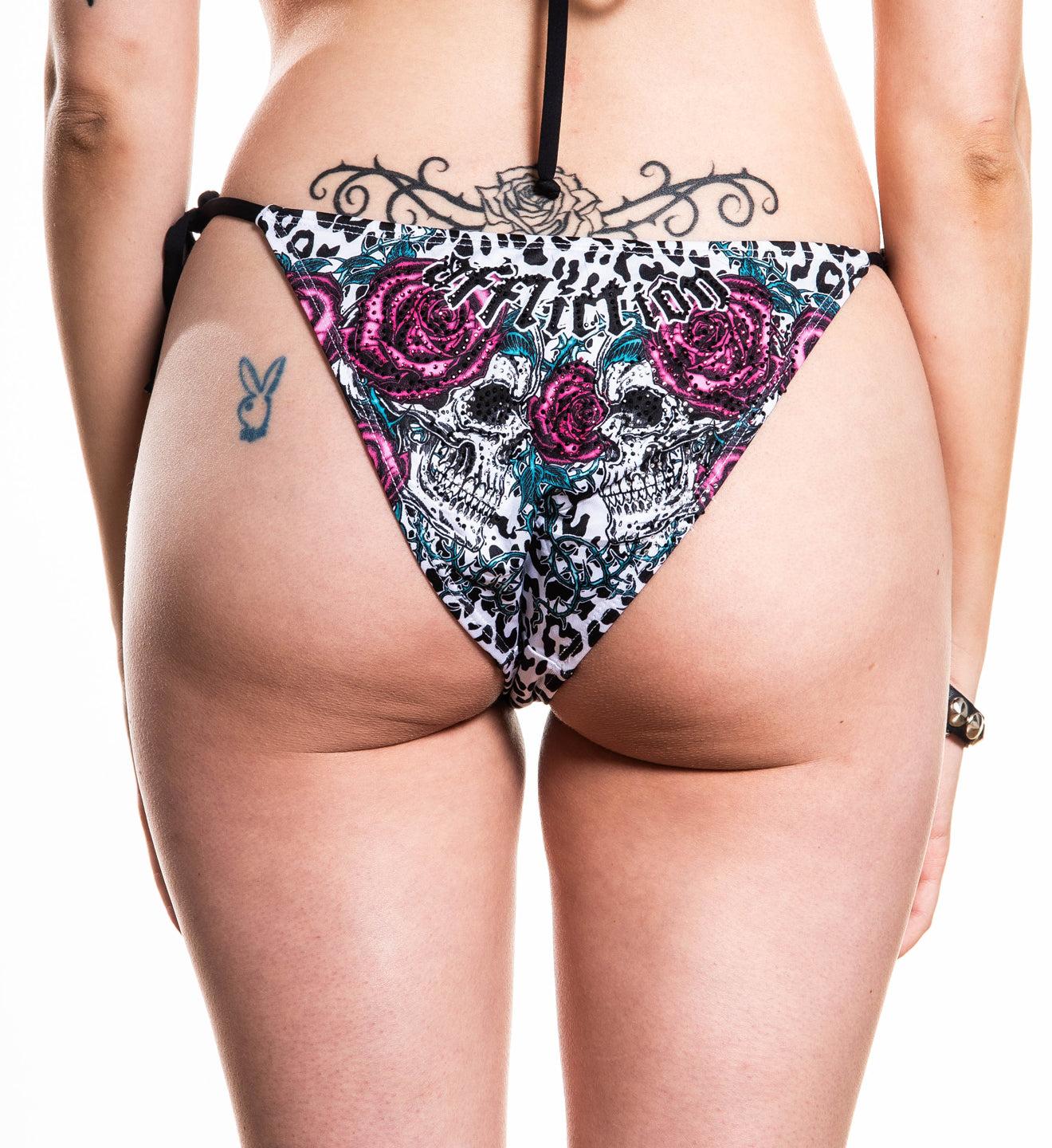 Affliction Women's Forgotten Bikini Bottom Rhinestones Over Artwork Pink Model wearing size S