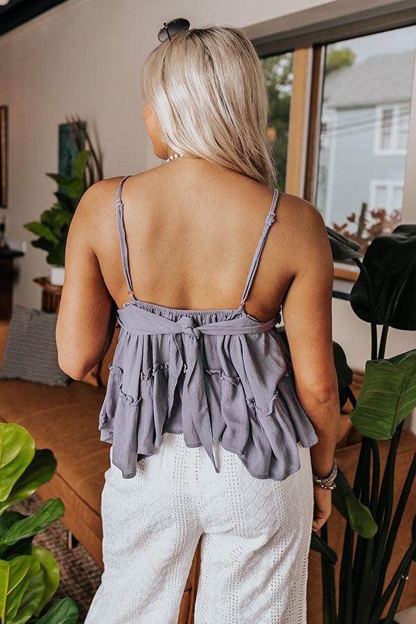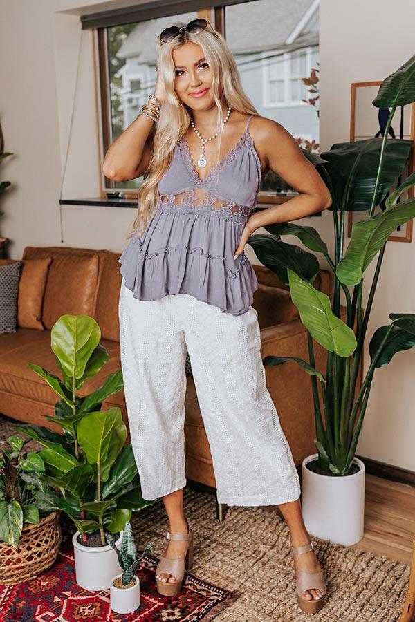Keep cool all summer long in our darling lilac grey hued 'Forgotten Love' tank featuring lightweight material with intricate lace trim detailing, a semi sheer waistline with a tie back closure, a v-cut neckline with adjustable spaghetti straps, and a flattering tiered silhouette that falls into an uneven hemline! Measurements S : Bust 28", Hip 30", Length 24", Waist 24". M : Bust 30", Hip 32", Length 25", Waist 26". L : Bust 32", Hip 34", Length 26", Waist 28".