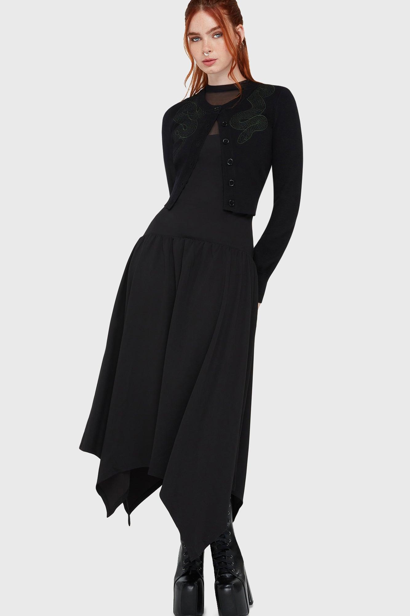 FORSAKEN GROVE- Soft stretchy twill jersey fabric.- Rounded neckline.- Shaped dropped waistline.- Gathered skirt and hankey hem.- Midi length.- Designed in Brighton, England.Model is 5'9 and wears a size XS.With KILLSTAR branding, 93% polyester 7% elastane.Machine wash cold (30°c) / Do not bleach / Do not tumble dry / Iron At Low Temperature / Do not dry clean. Imported.Wander into Forest Fable. Embrace a winter collection inspired by the serene hues and textures of the natural and spirit worlds. Fall in love with effortless shapes and organic tones that echo the gentle rhythm of the woodlands, and marvel at delicate embroideries that trace the haunting beauty of foliage and botanicals. It's time to step into the dark season with an enchanting new winter wardrobe.