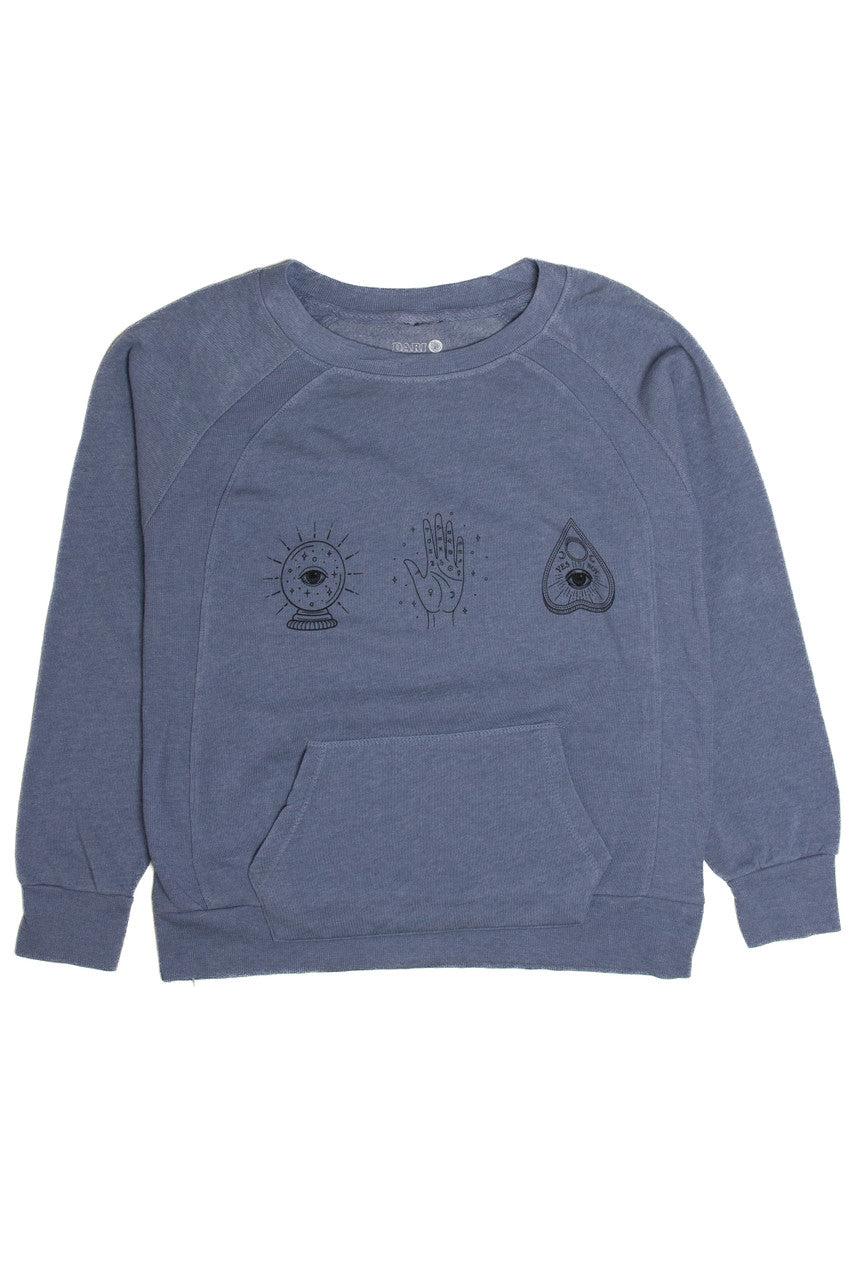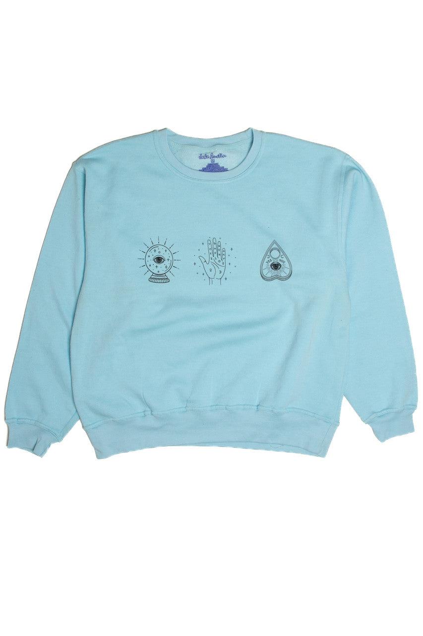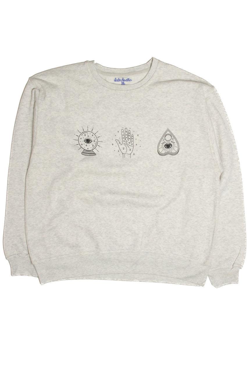 This fortune teller design is screen printed on a variety of sweatshirts; their individual measurements are taken laid flat and listed below in the same order they're pictured.