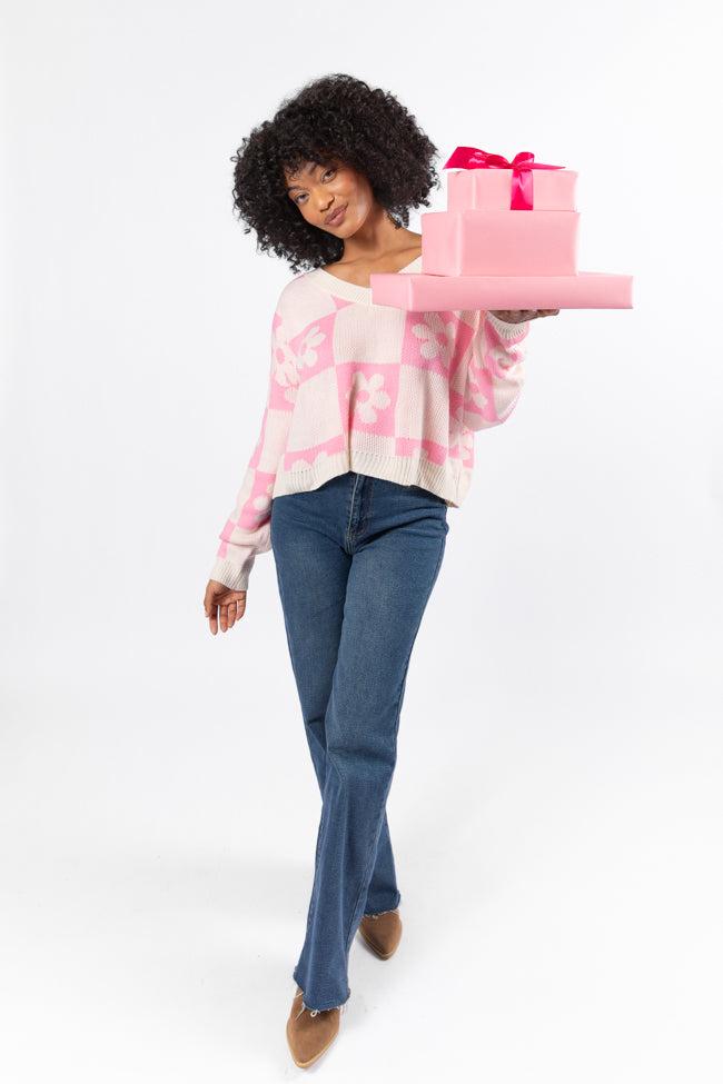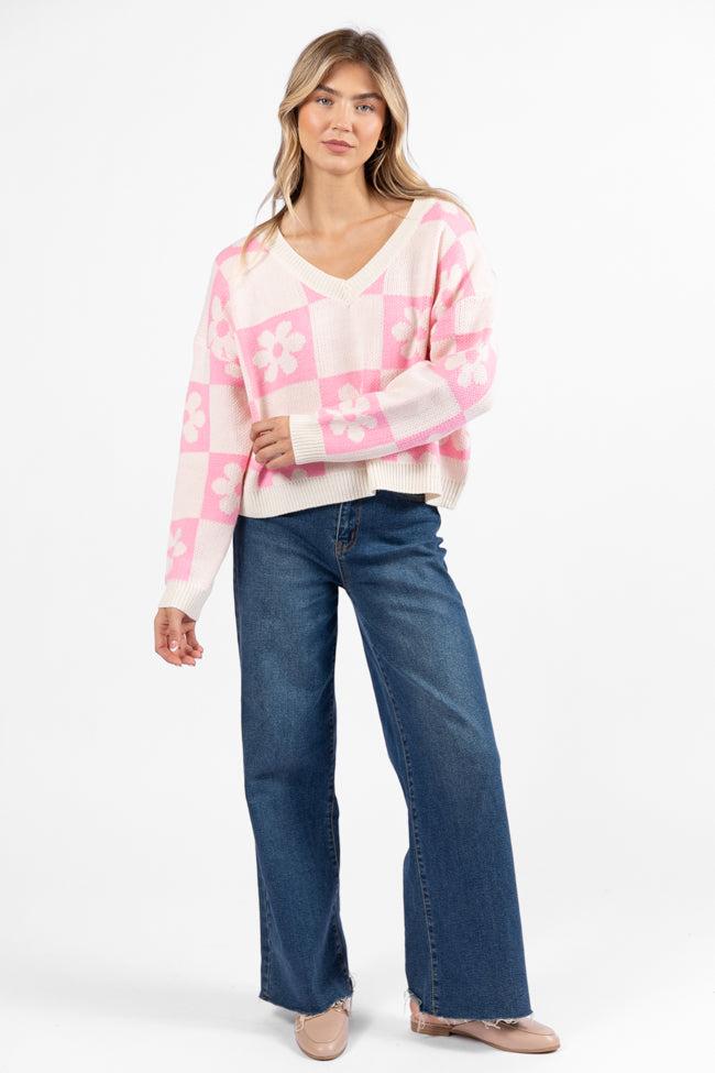 Details Pink V-Neck Checkered Flower Sweater Fabric has stretch Crew neckline with long sleeves Pair this with jeans and booties! Unlined Size small from shoulder to hem: 24.5" Material and Care 100% acrylic Cold gentle machine wash, line dry Patterns may vary Materials may have natural variations Colors may vary from different viewing devices.