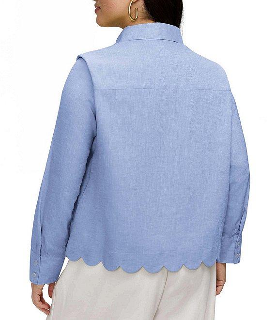 From Foxcroft Plus, this blouse features: Point collar Long sleeves Scalloped hem Relaxed fit Back yoke Button-front closure Linen/viscose Machine wash/tumble dry Imported.