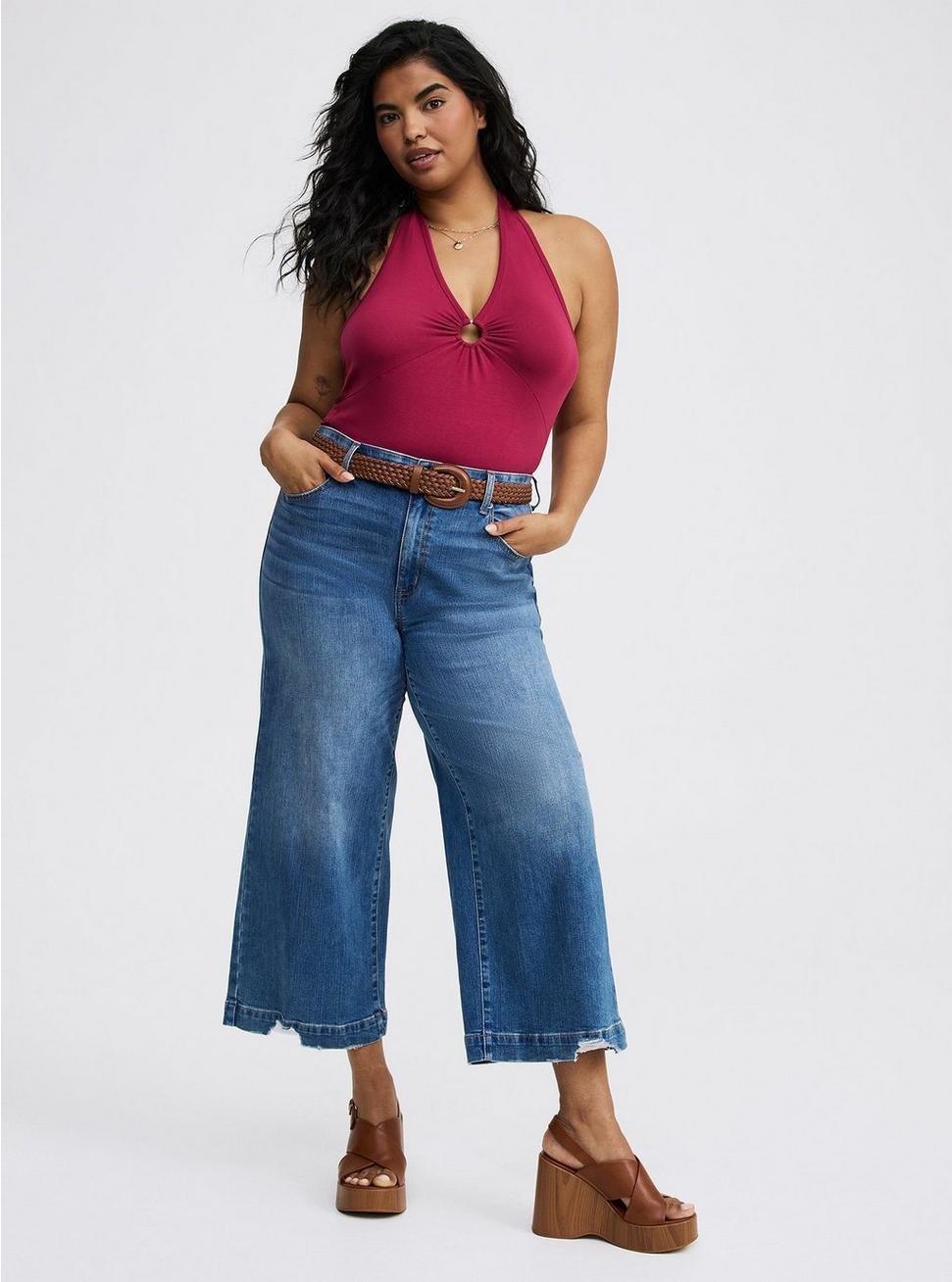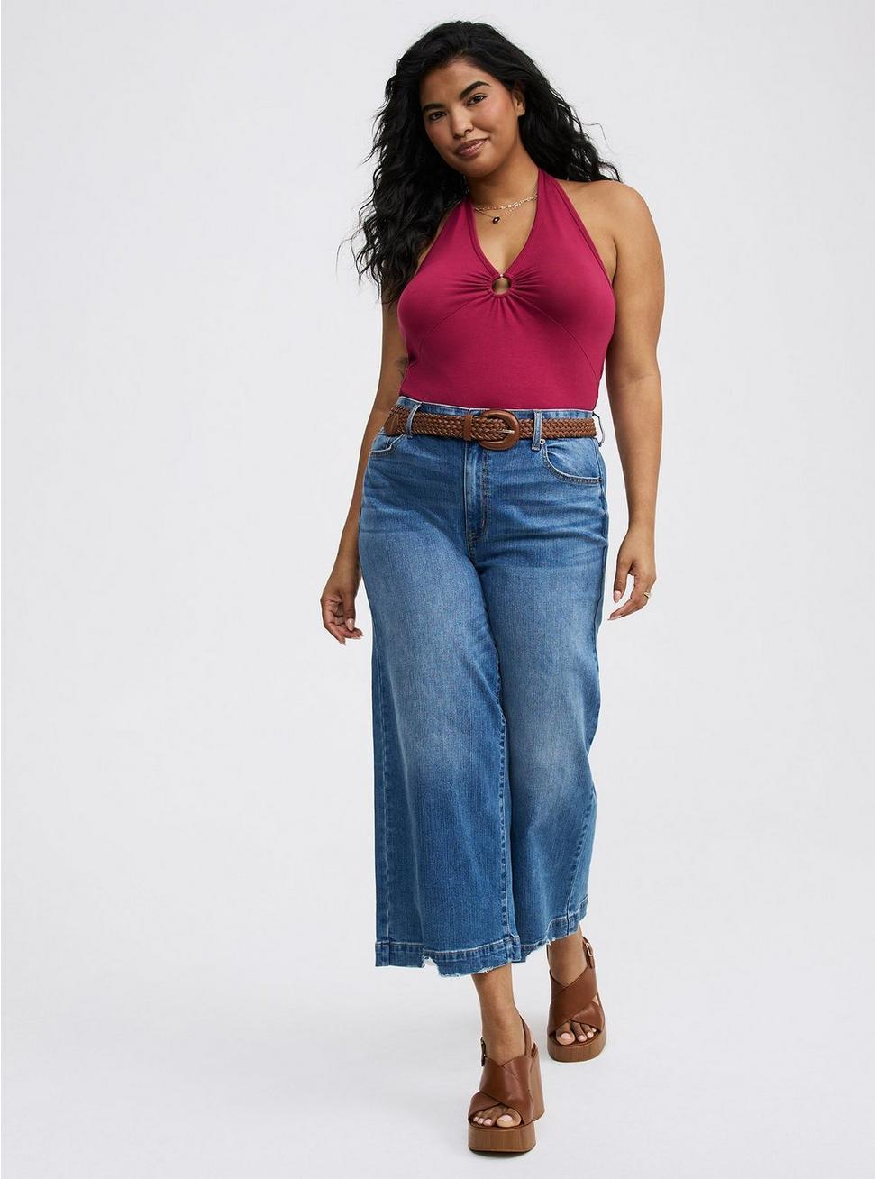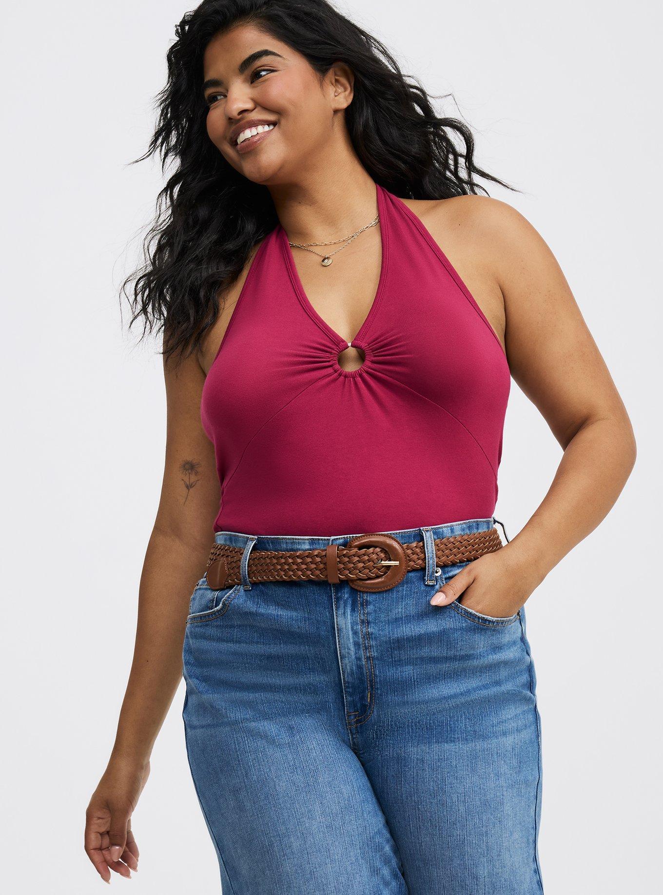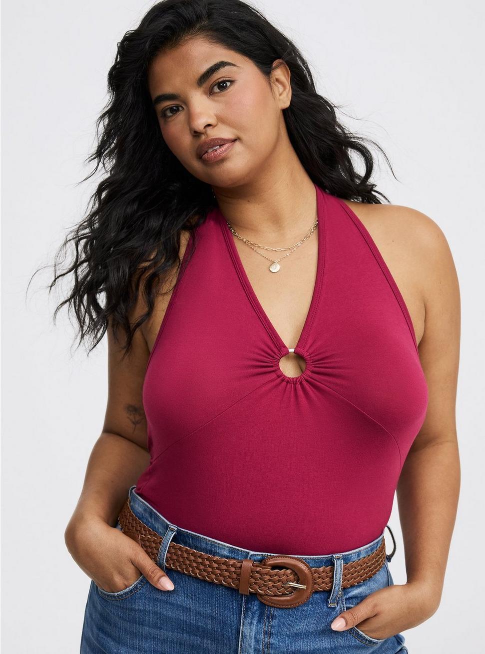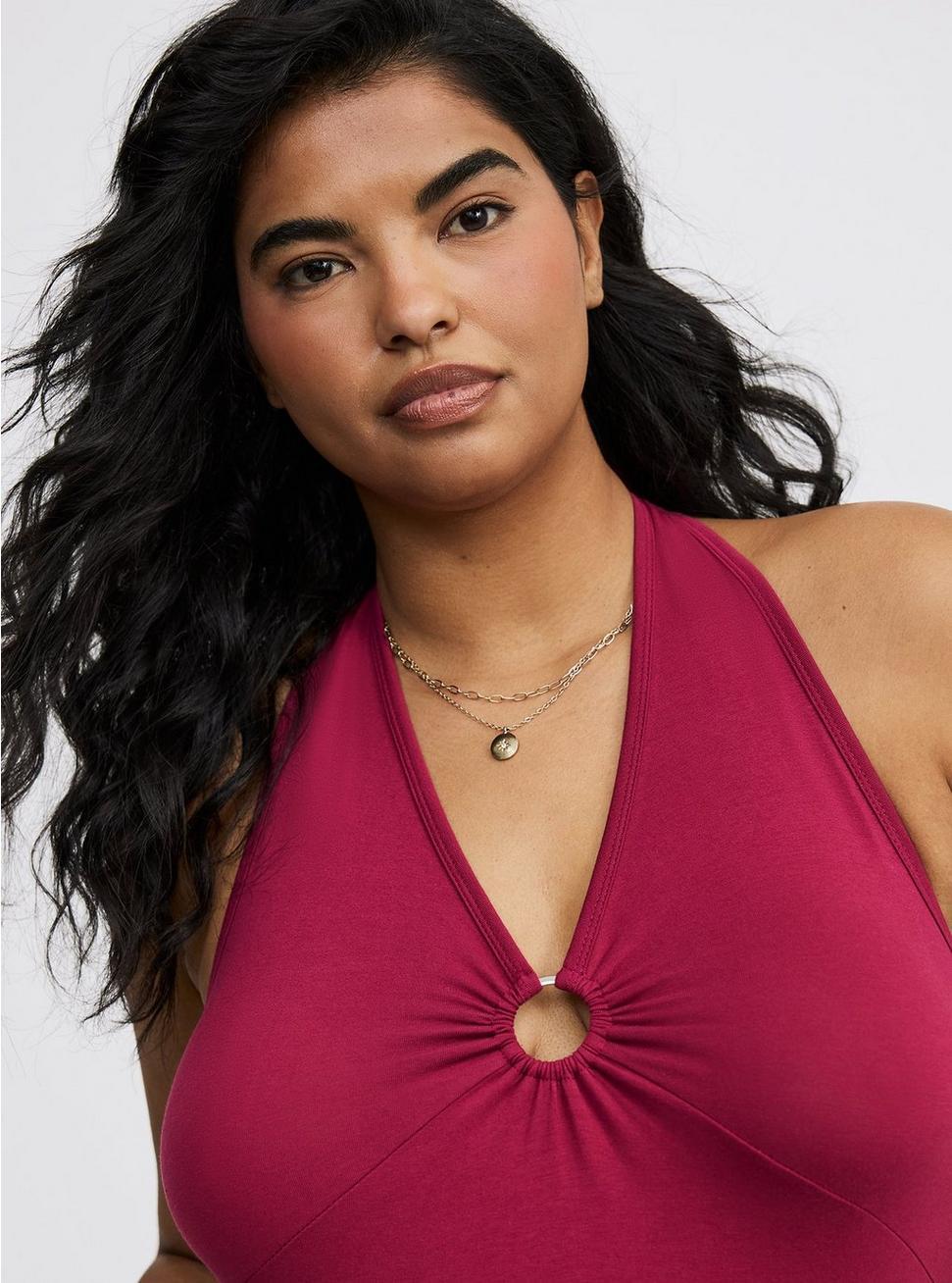 FITMeasures 28'' from shoulder (size 2). MATERIALS + CAREFoxy knit fabric: Holds you in, smooths you out and doesn't ride up.Stretch level: Maximum.95% cotton, 5% spandex.Machine wash cold. Tumble dry low.Imported.DETAILSHalter neckline.Sleeveless. O-ring detail.