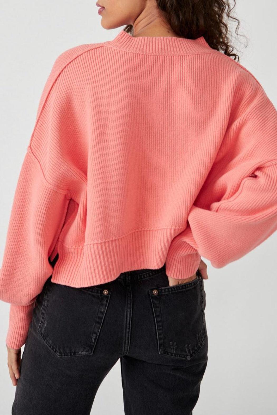 Fresh as guava! Cropped, slouchy-fit sweater with ribbed knit. Mock neckline and defining seams for added flair. Pair with trousers or skirts. Guava Juice 1% Elastane, 37% Acrylic, 56% Cotton, 6% Polyamide SHOULDER TO HEM LENGTH 17