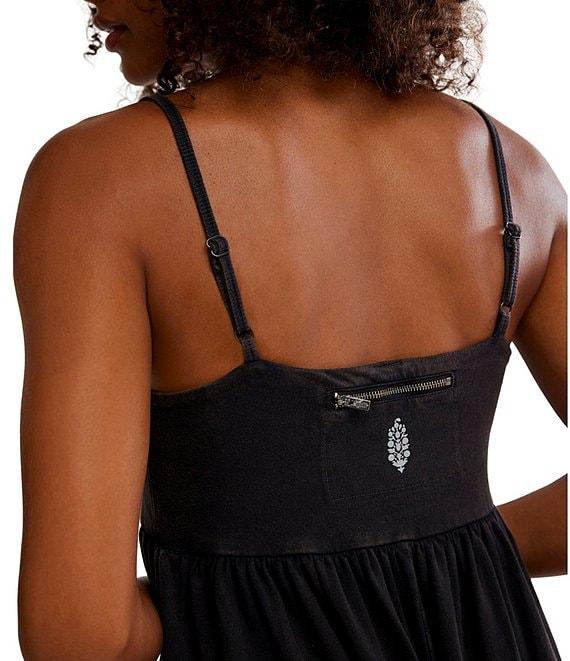 From Free People, this jumpsuit features: Square neckline Sleeveless Adjustable spaghetti straps Empire-style waist Side pockets Back zip pocket Wide leg Pleating detail Relaxed fit Pull-on construction Approx. 30" inseam Cotton/elastane Machine wash Imported.