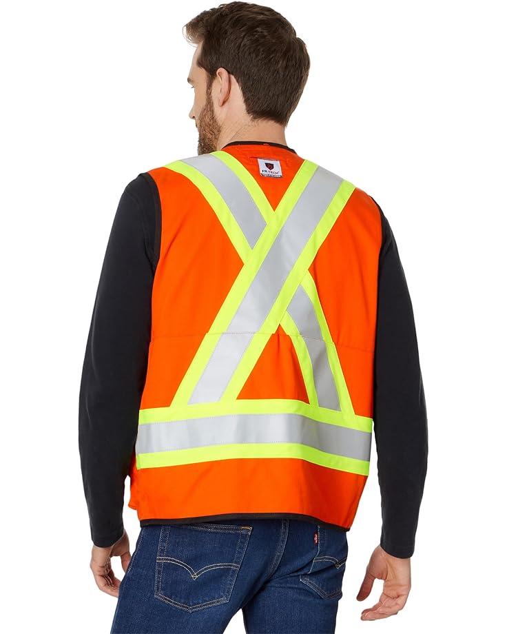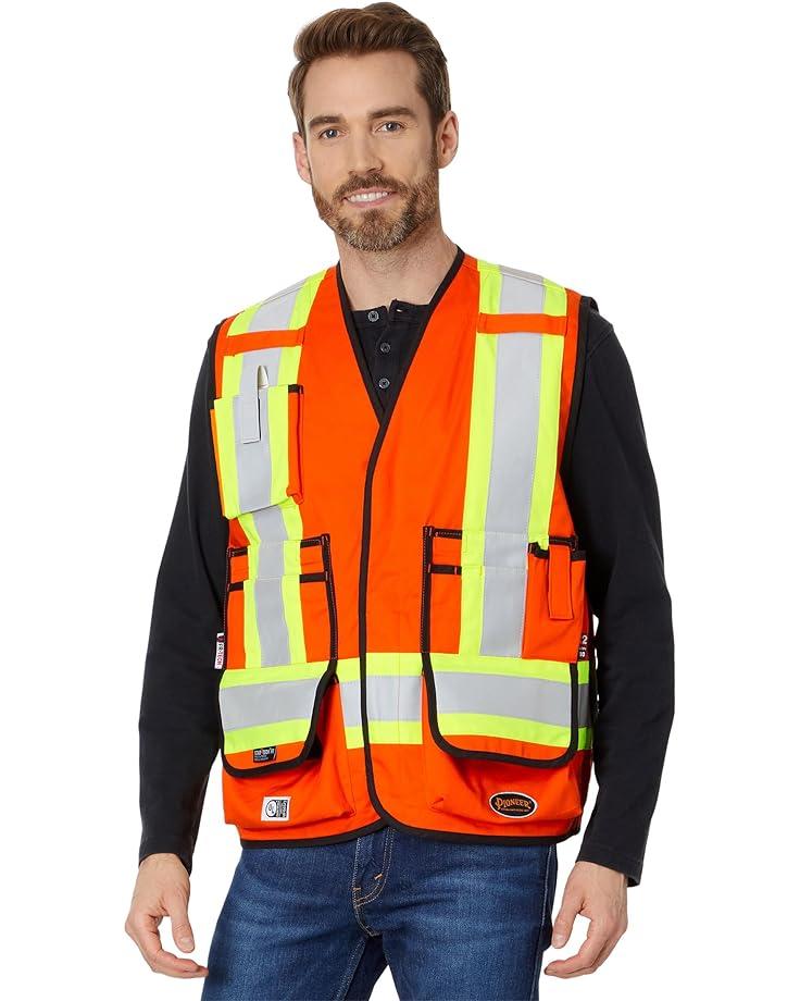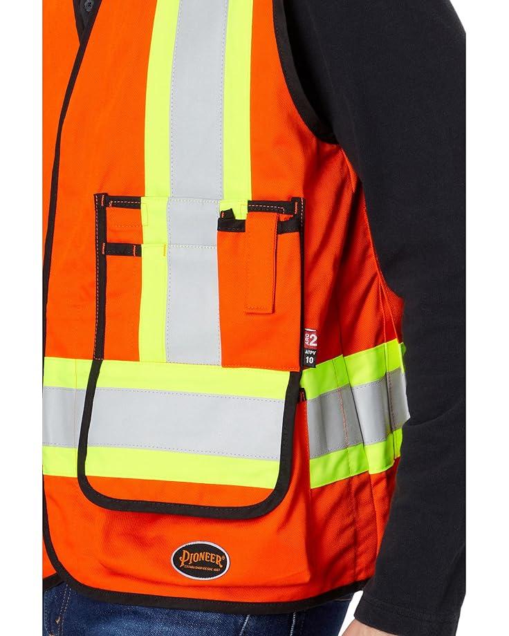 Stay visible on the jobsite in the Pioneer 7732U 88/12 7 oz. Surveyor Vest High-Visibility. Featuring a metal snap front closure in a sleeveless design with multiple front pockets, including a cellphone pocket, four inner pockets, a big back pouch with zipper opening and a D-ring access slot and hanger loop.