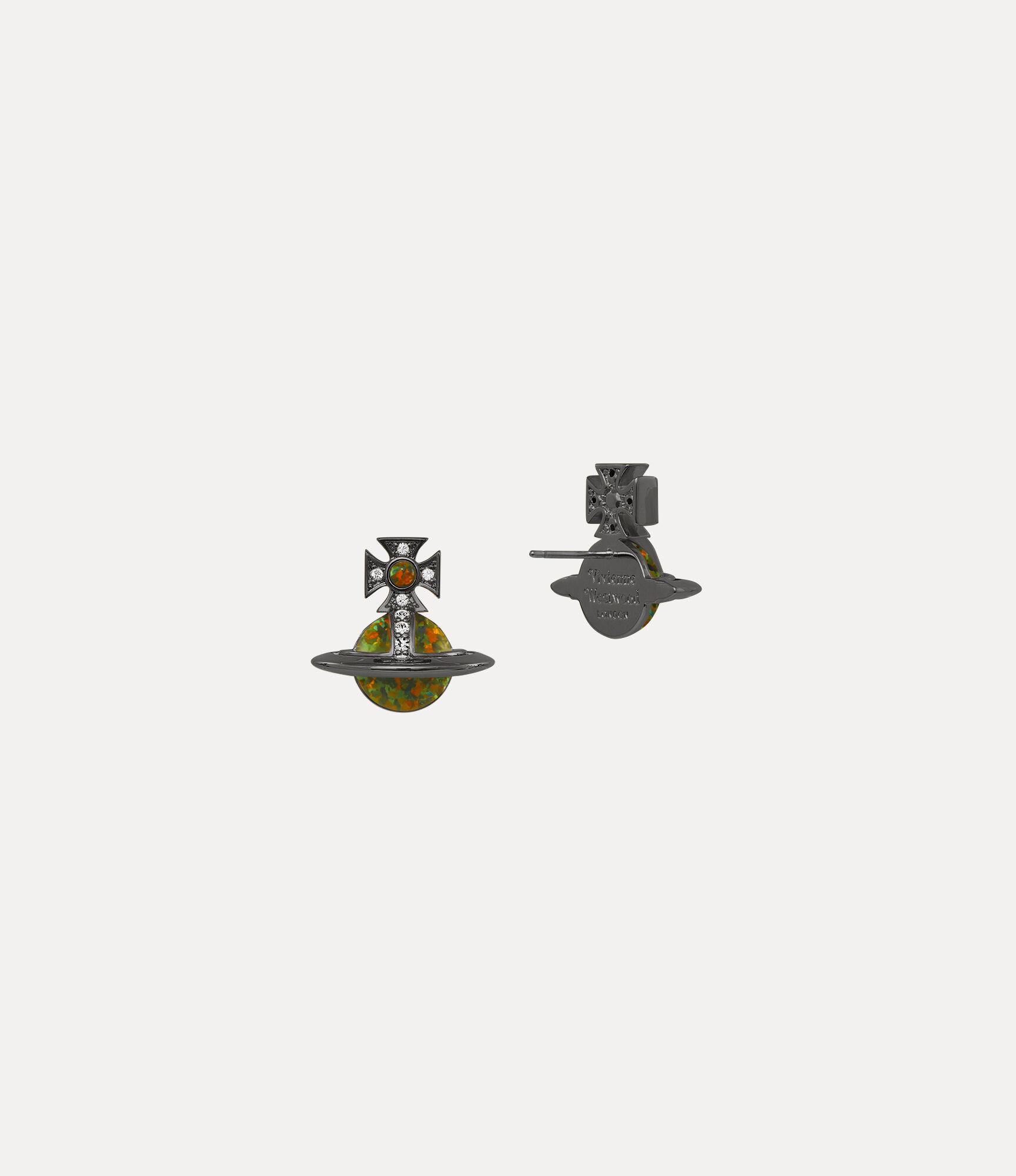 The Franca earrings are offered in polished, gunmetal-tone plating, with a distinct three-dimensional effect orb in the centre of the design, inspired by our house's signature orb-shaped motif. Encrusted with white crystals and multi-coloured synthetic opal gemstones, the piece recalls the house's ethos of linking the past to the future.