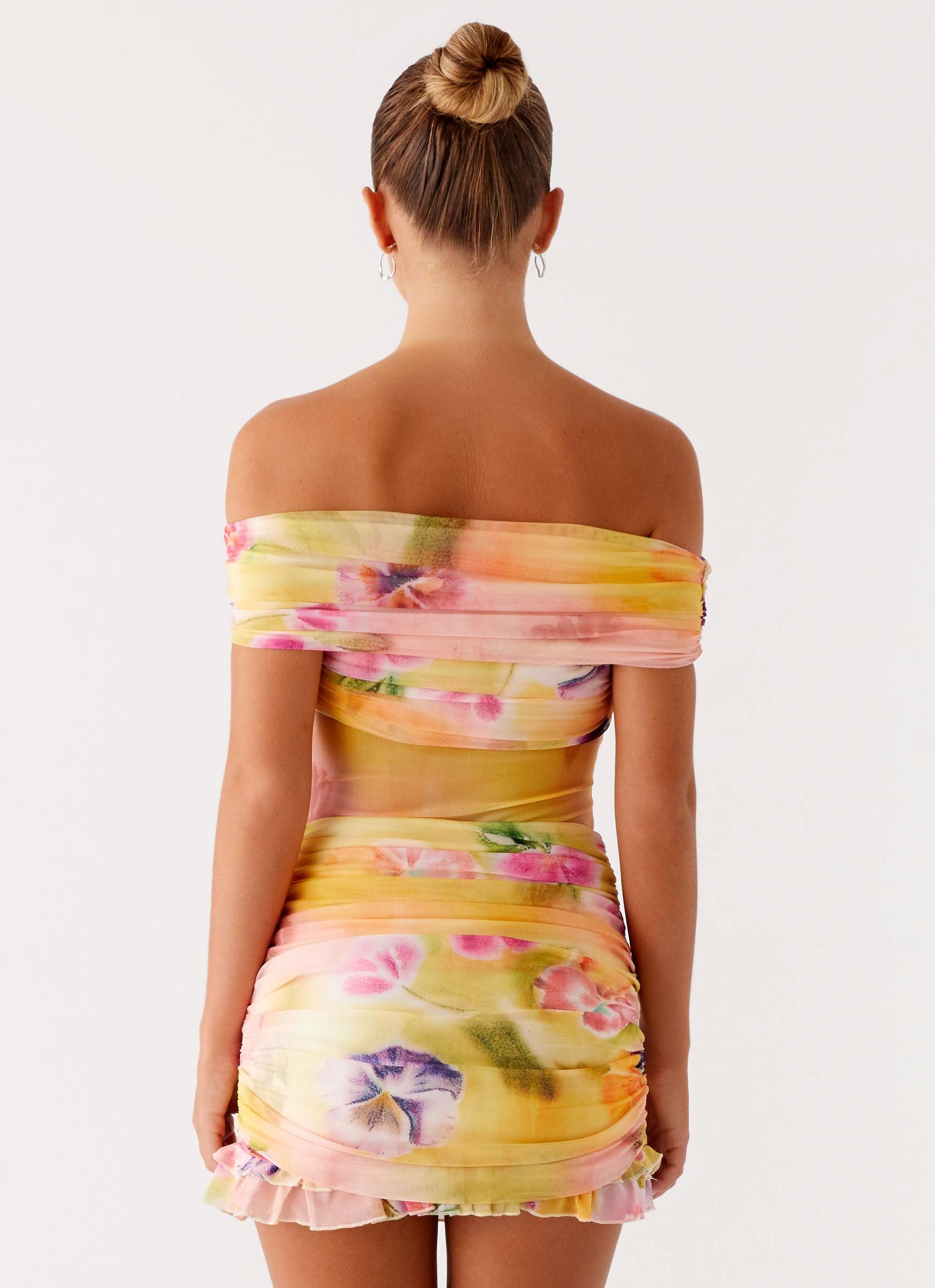 Peppermayo Exclusive The Frances Mini Dress is where elegance meets effortless style. With its off-shoulder neckline, it offers a sultry, feminine look, while the ruched shoulder seams add a unique touch of texture and sophistication. The mini length keeps it playful and bold, making this dress perfect for those spontaneous nights out. - Off-shoulder neckline- Mini length- Ruched shoulder seam, bustier, and front waistband- Stretch mesh- Lined bustier and waist- Semi-sheer bodice- Frill hemline- Exclusive print (print placement may differ per garment)- Fabric: 95% Polyester, 5% Spandex Size AU 8 / US 4 garment measurements: Length - 60 cm / 23.6 inBust - 70 cm / 27.6 inWaist - 61 cm / 24 inHip - 83 cm / 32.7 inHem - 86 cm / 33.9 inSleeve Length - 54 cm / 21.3 in Yasmin is 170cm and wearing a size AU 8 / and US 4