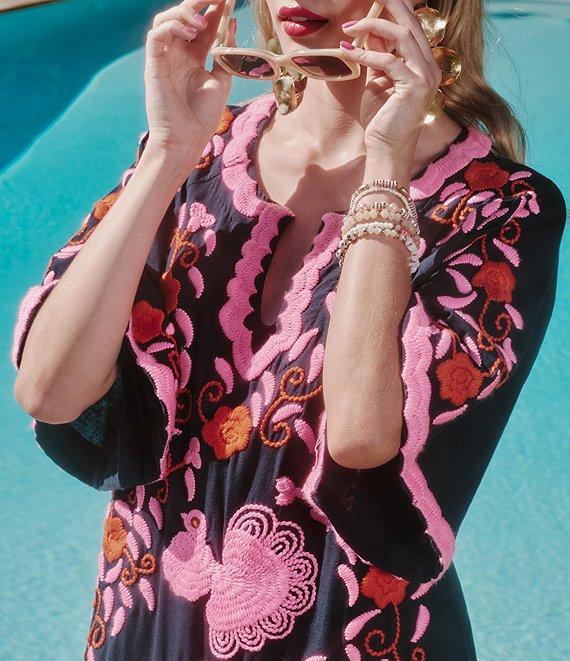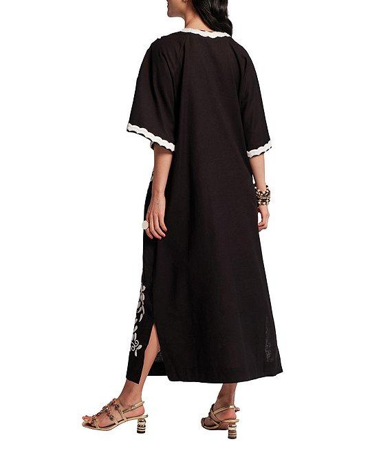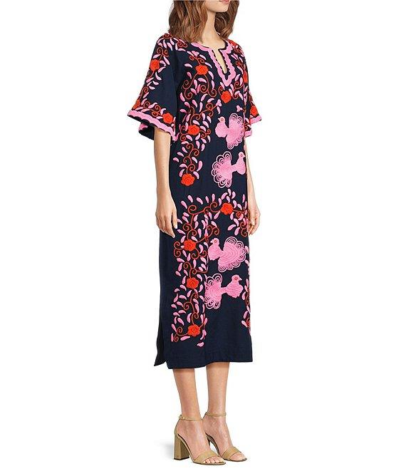 FRANCES VALENTINE Charming Peacock Embroidery Split V-Neck 3/4 Sleeve Caftan Maxi Dress