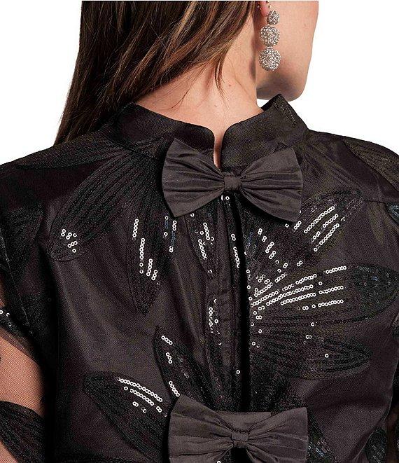 FRANCES VALENTINE Diplomat Sequin Floral Tulle Mesh Mock Neck 3/4 Sleeve Dress