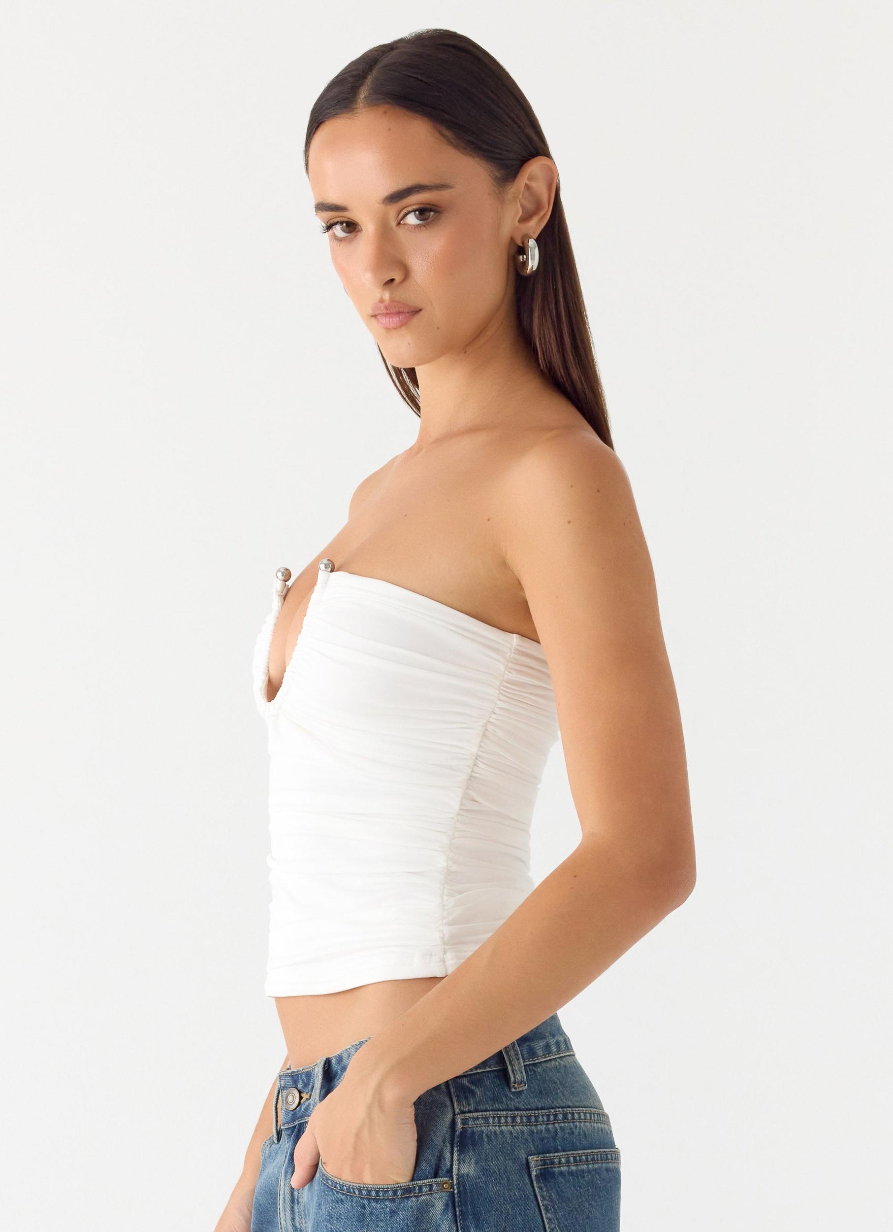 Peppermayo Exclusive The Francis Top is made for evenings that transition effortlessly from golden hour to after-dark moments. Featuring a strapless deep plunge neckline and stretch jersey fabrication, this crop-length style hugs the body with confidence and ease. Front metal hardware adds an editorial edge, making it perfect for warm nights and playful escapes. - Strapless deep plunge neckline- Front metal hardware- Stretch jersey fabrication- Crop length- Fabric: 95% Polyester, 5% Elastane Size AU 8 / US 4 garment measurements:Bust: 70 cm / 27.56 inWaist: 60 cm / 23.62 inHem: 74 cm / 29.13 inLength: 29 cm / 11.42 in Roberta is 177cm and wears size AU 6 / size US 2
