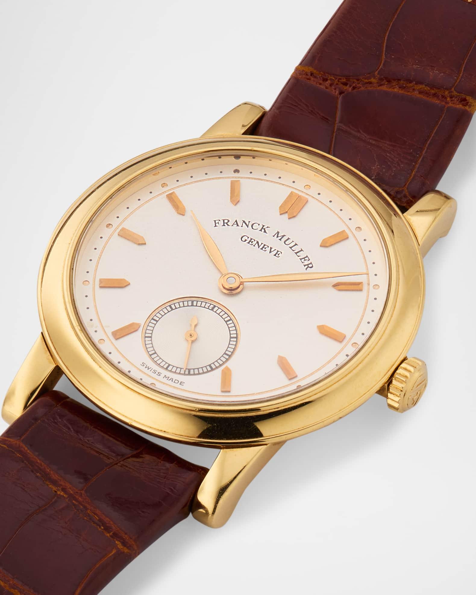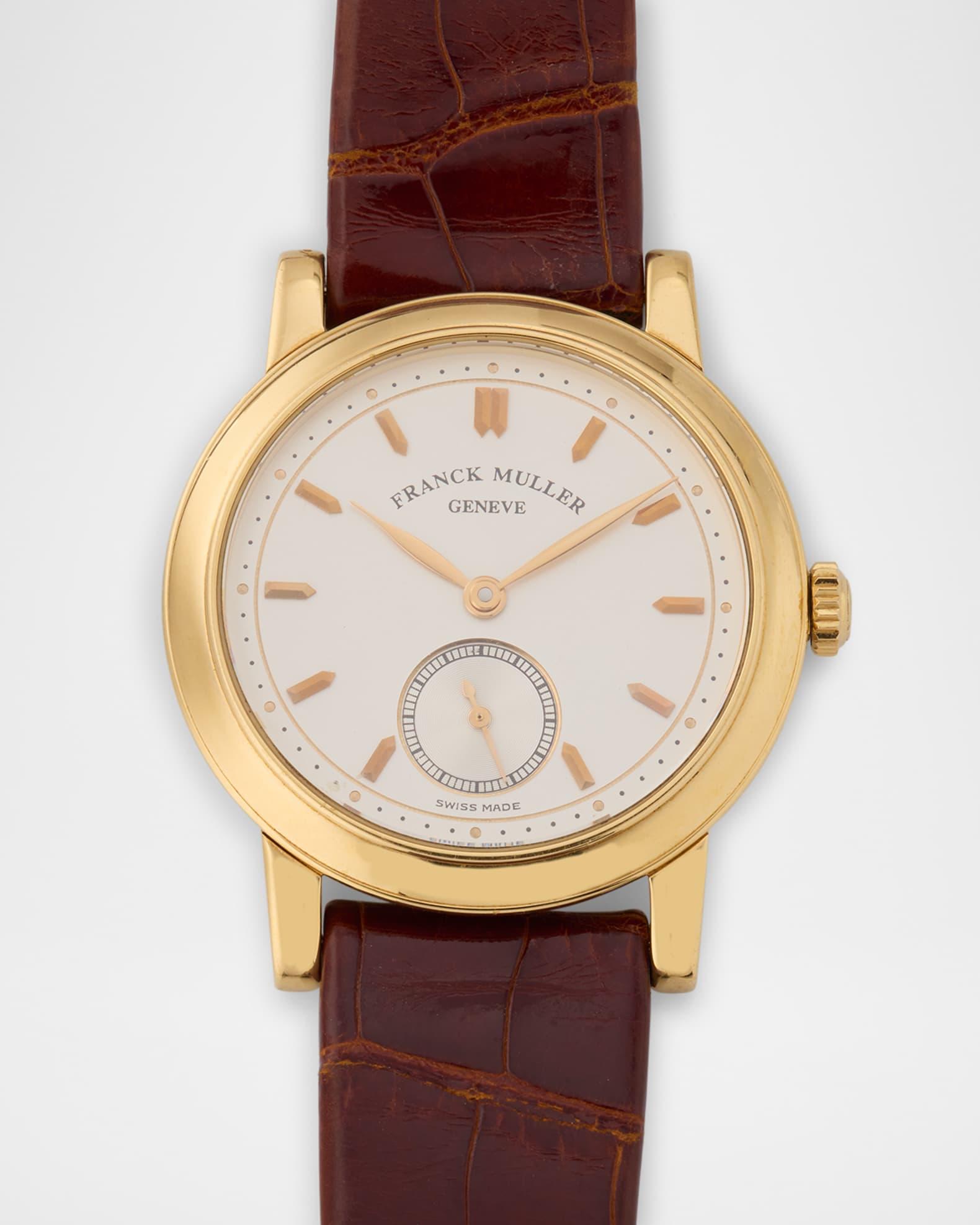 Frank Muller defines class and excellence through the brand's luxury timepieces. This watch is crafted with precious materials and great skill for a premium appearance. Approx. 34mm round snap-back case 18-karat yellow gold watch head White dial with pointed markers Subsidary seconds Feuille hands Sapphire crystal window Reference # 1900 S6 Manual wind movement Caliber 7500 Franck Muller brown alligator strap 18-karat yellow gold tang buckle Each Vintage Watch purchase includes a Neiman Marcus watch box and a Neiman Marcus certificate of authenticity. Original boxes and papers are not offered in most instances and will be noted on the site when they are included. Circa 1990s Made in Switzerland Please Note: All watches have a one-year warranty on parts and labor, excluding stem and crystal. A watch that has been dropped, abused, or overwound is not covered under the warrant. This watch is FINAL SALE.