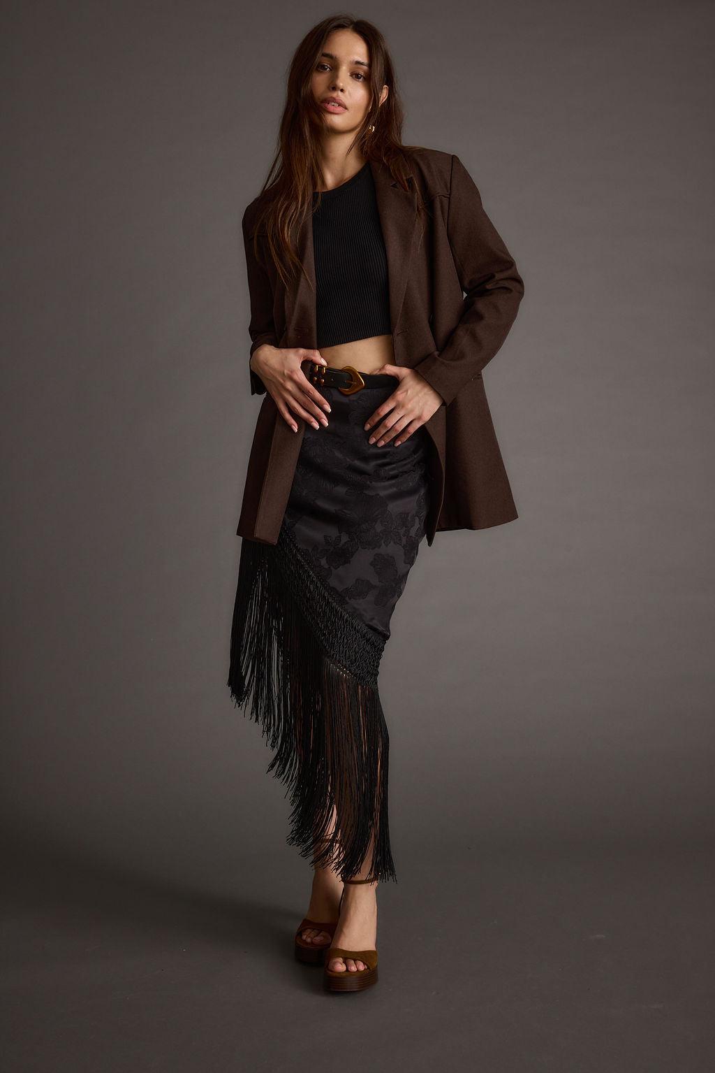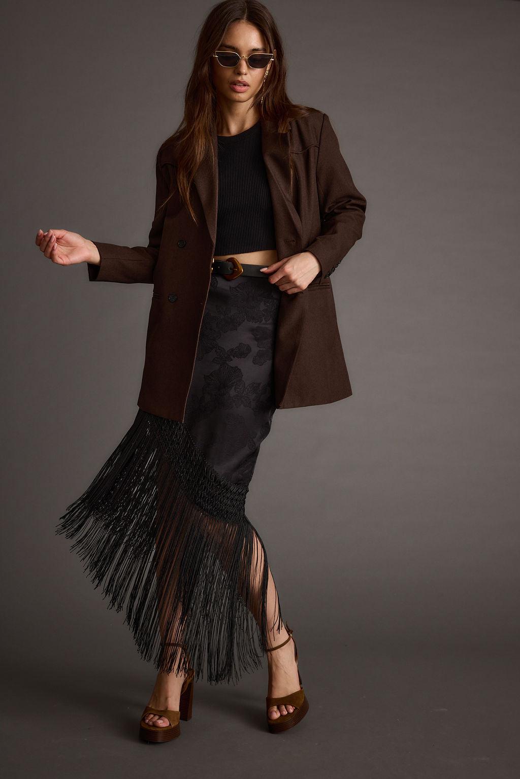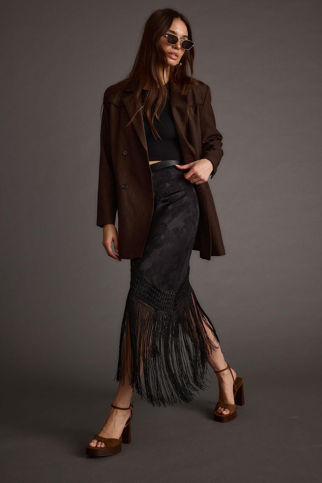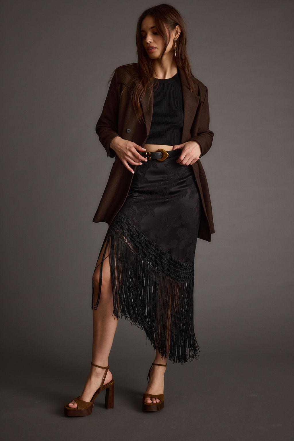 Based on the best selling Frankie Satin Jacquard Fringe Skirt, we’re bringing her back now in a chic black colorway. BOHO GLAM IS BACK! Spotlights on you in this one of a kind midi skirt featuring fringe detailing and a dreamy satin jacquard material. The Frankie Black Satin Jacquard Fringe Midi Skirt will dance with your every step as you take on the night or grab coffee with the girls. Complete the look with a cute tee, boots and maximize on chunky accessories for a boho look we’re obsessed with.
