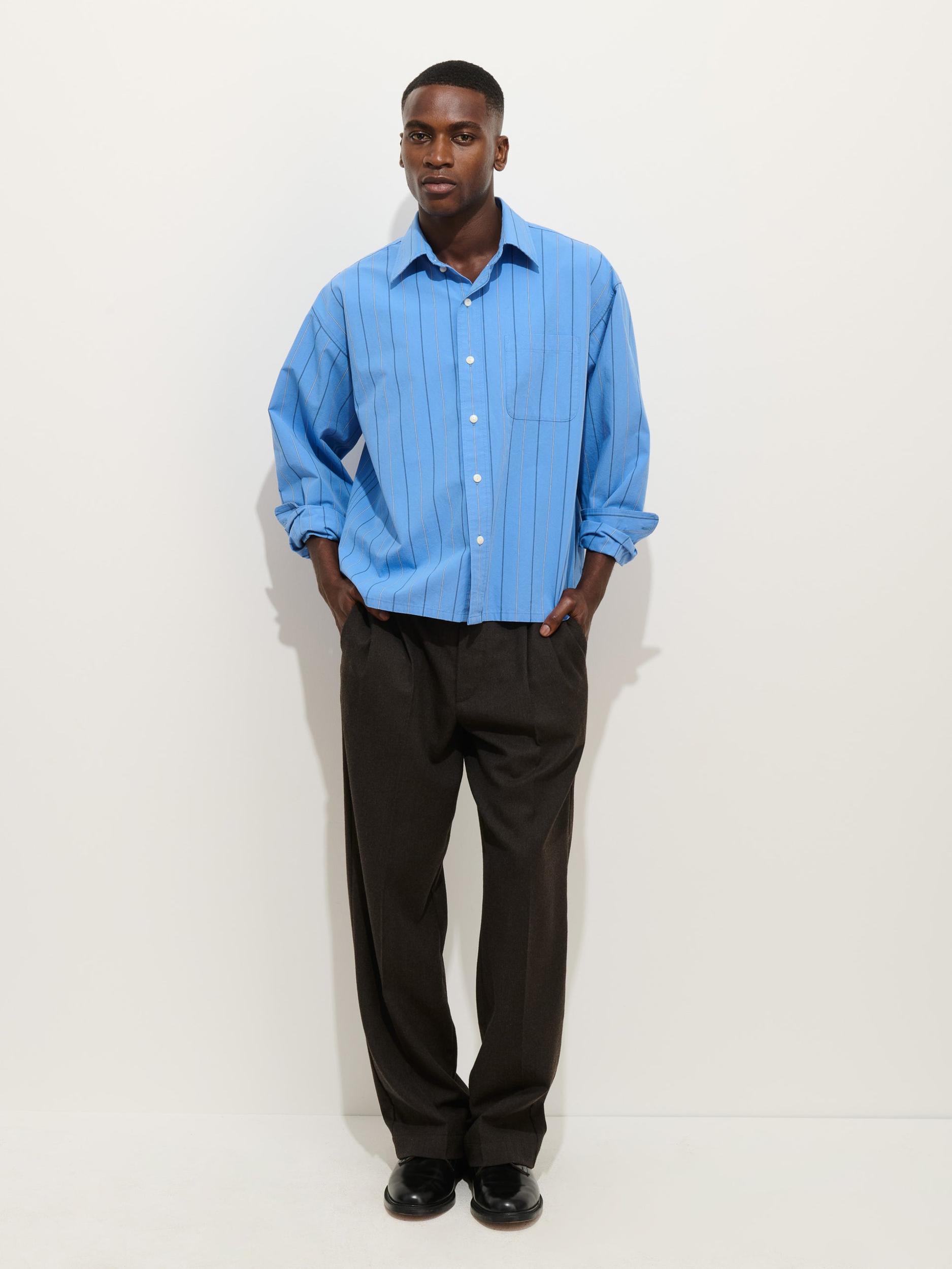 Fresh new take on a button down Details we love: Heavy weight cotton poplin, Drop shoulder, boxy, straight hem, articulated sleeves, sleeve pleats, side vent, 100% cotton Design notes: “The shirt I'm most excited to wear this season, I'm getting all the colors and stripes” - Jordan, Men’s Designer intended to fit over