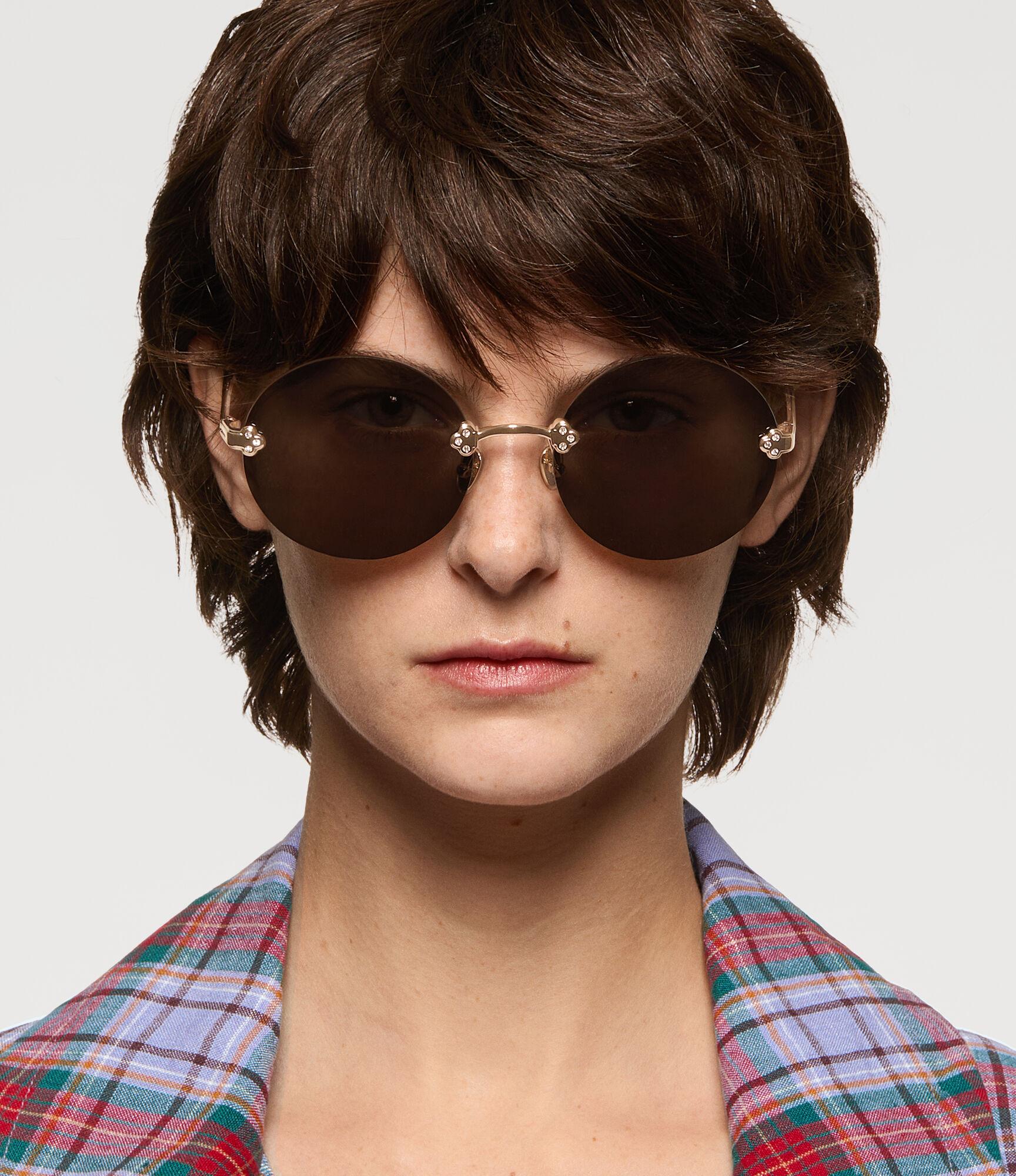 The Franklin sunglasses offer a circular, rimless silhouette, adorned with Swarovski-embellished ornate detailing inspired by Baroque and Victorian Gothic styles. The delicate design is completed with tortoiseshell tips, offering an elegant contrast to the gold-tone metal.