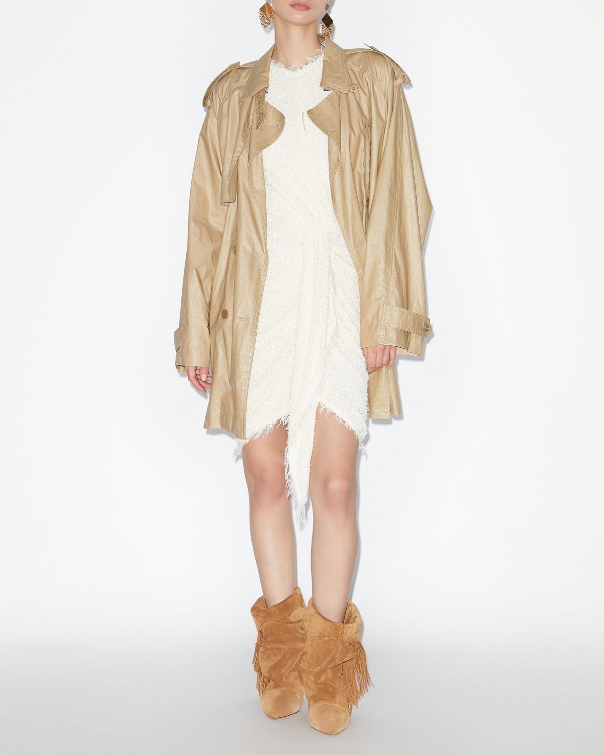 Mid-length trench coat in coated linenCollar with adjustable tab and hook Buttoned shoulder tabs with loops Long raglan sleeves with buttoned tabsFlaps Chest pocket Buttoned crossover frontRemovable belt with loops Flap pockets on the sidesMetal rivetsUnlined fabricStyle: MA0408FAC1C01I90BE FRANNY