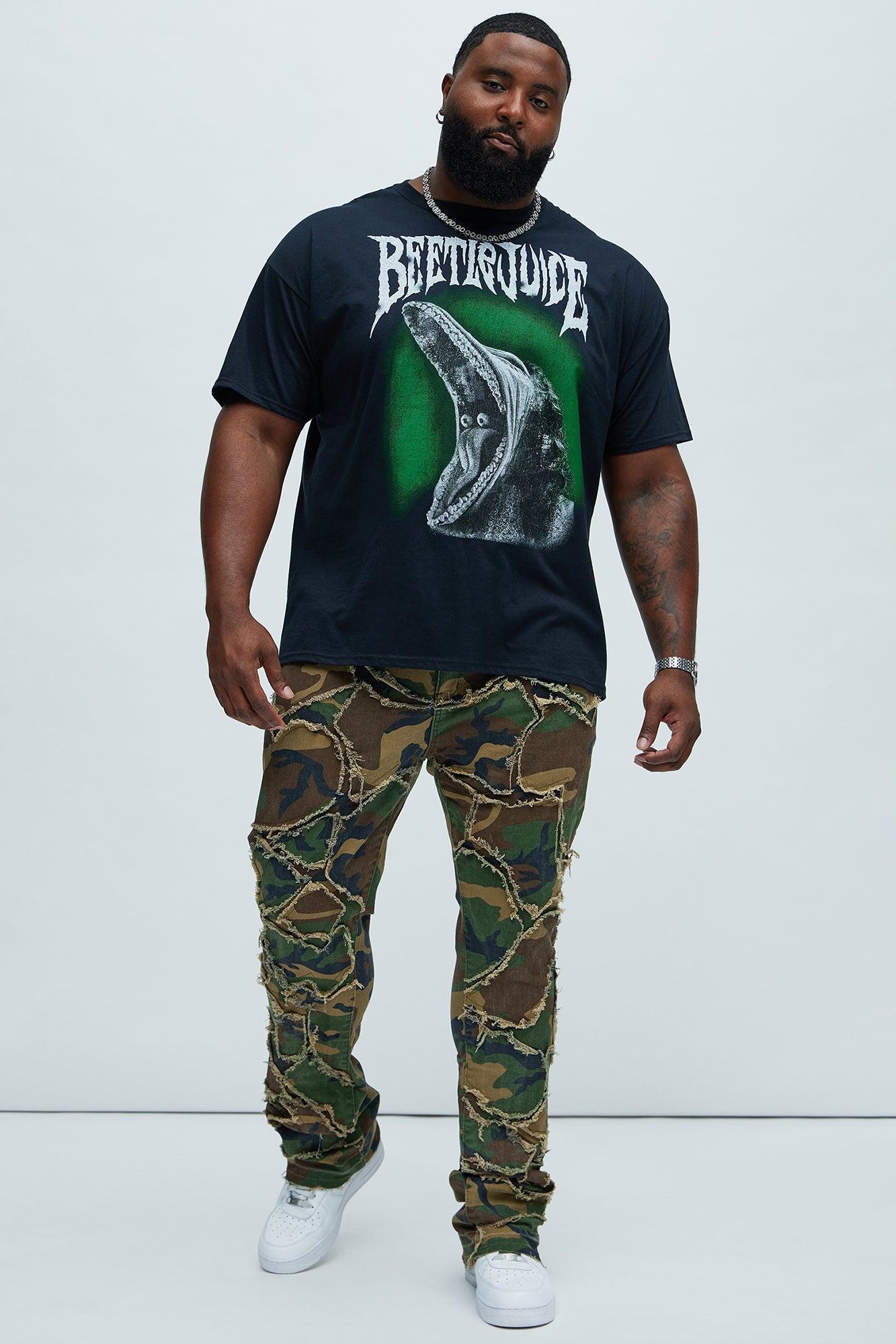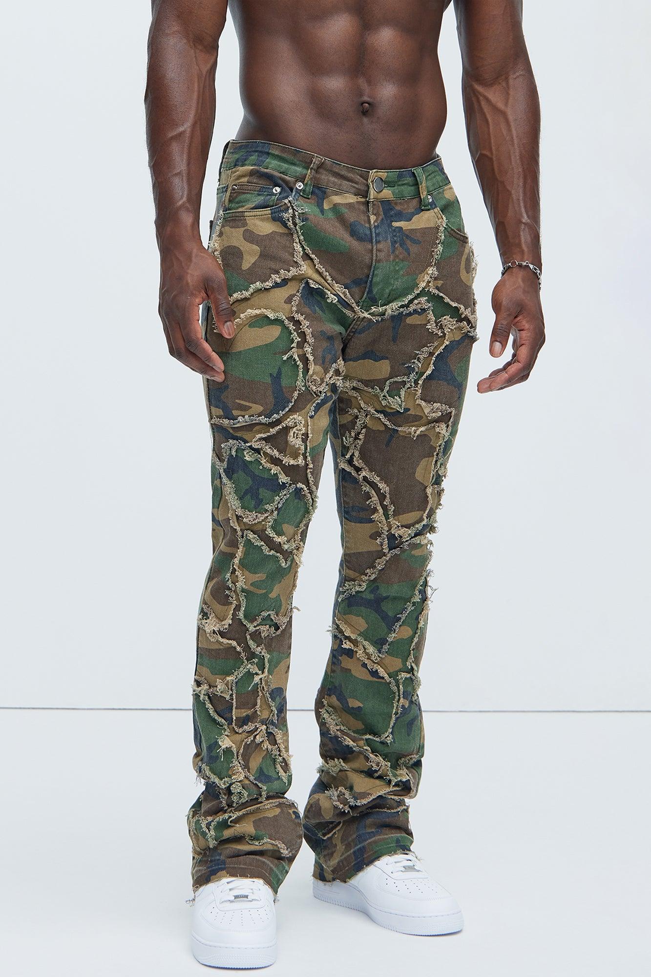 Available In Camouflage. Stacked Skinny Flare Fit 5 Pocket Detail 97% Cotton 3% Spandex Disclaimer: Due To The Specialized Distressing & Wash Process, Each Garment Is Unique. Zip Fly Button Closure Fray Detail Open Hem Imported