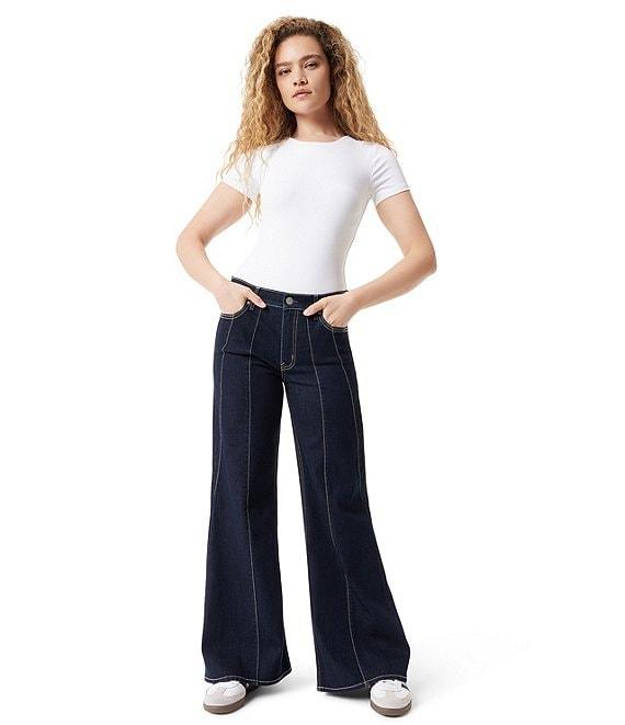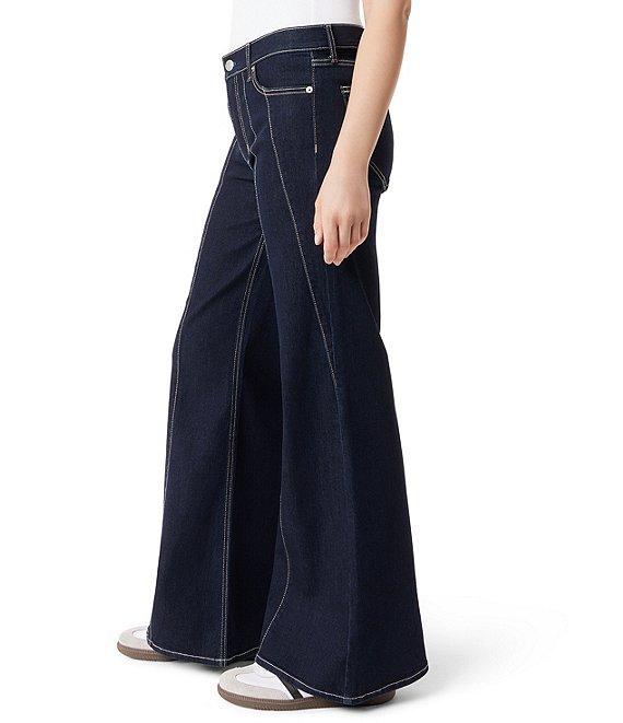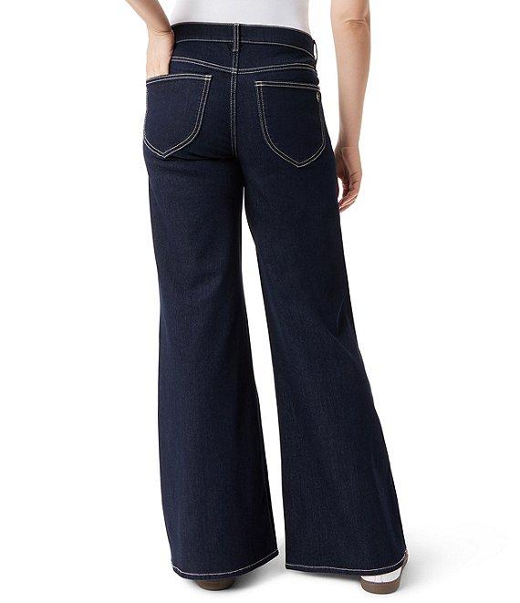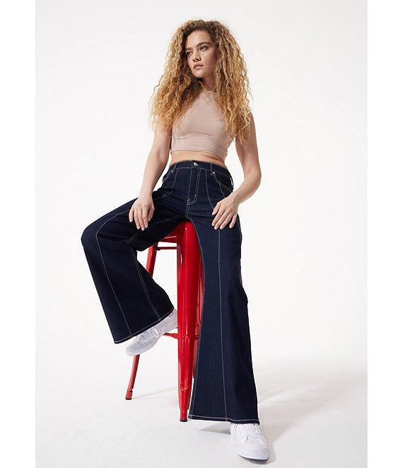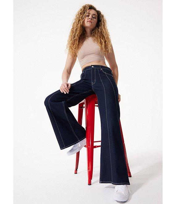 From FRAYED Jeans, these jeans feature: Low rise Bell bottom fit Belt loops Flared Front button and zipper closure Trims 5-pocket style Approx. 30" inseam Embroidery on the wearer's right back pocket Clean hem Cotton/polyester/viscose/spandex Machine washable/tumble dry Imported.