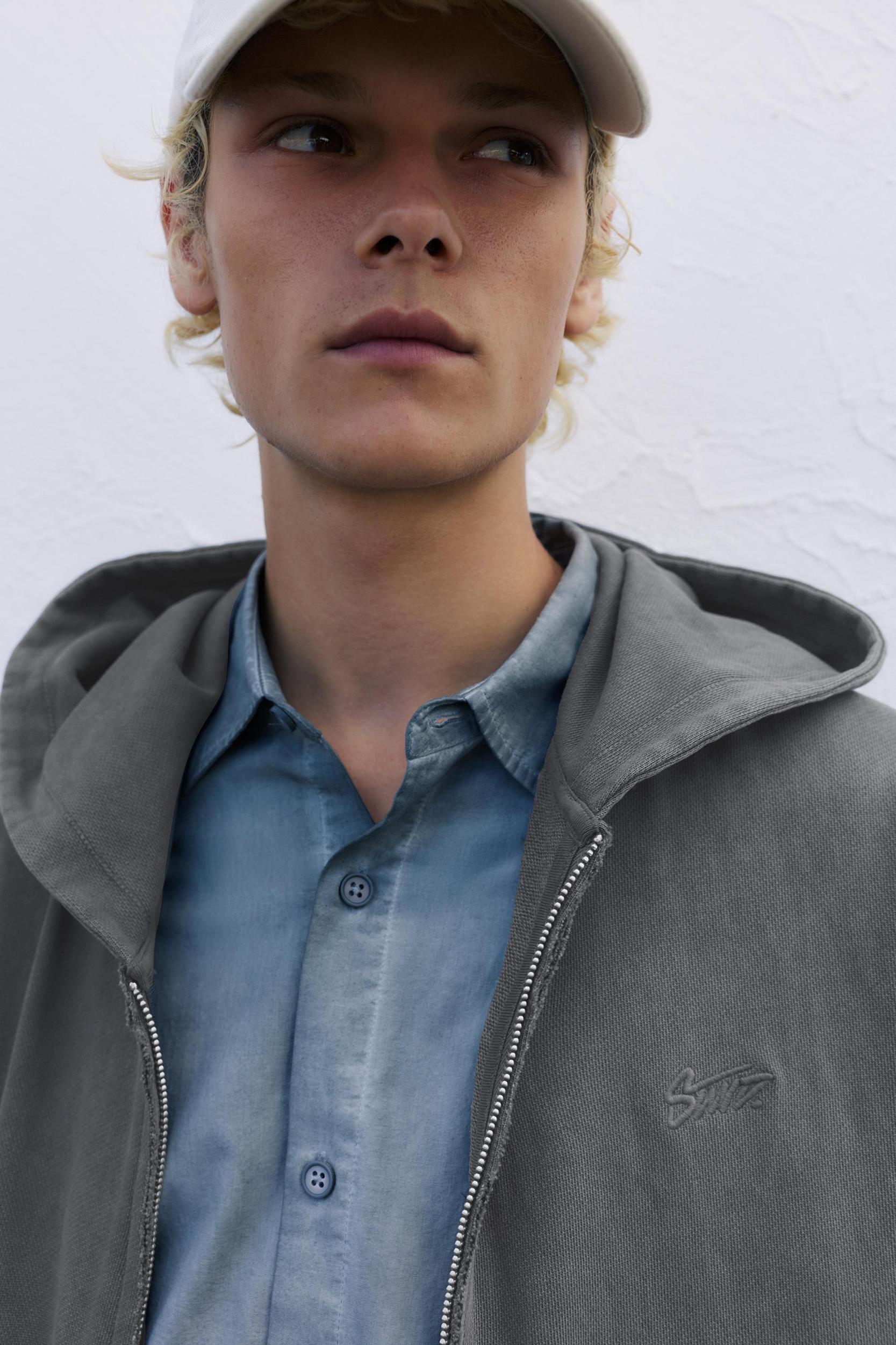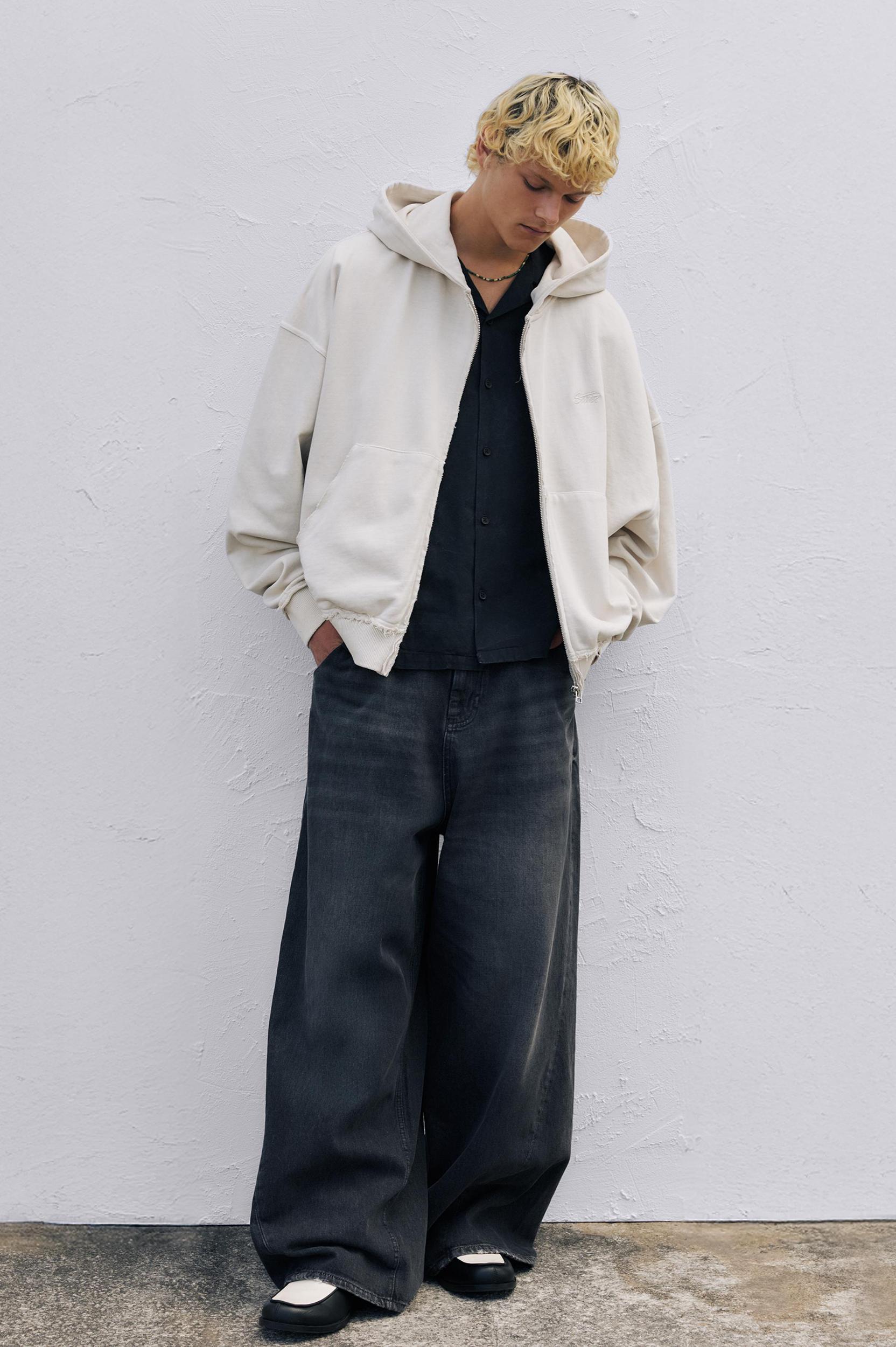 Hoodie with zip fastening, STWD embroidery on the front, pouch pocket, and frayed finishes.