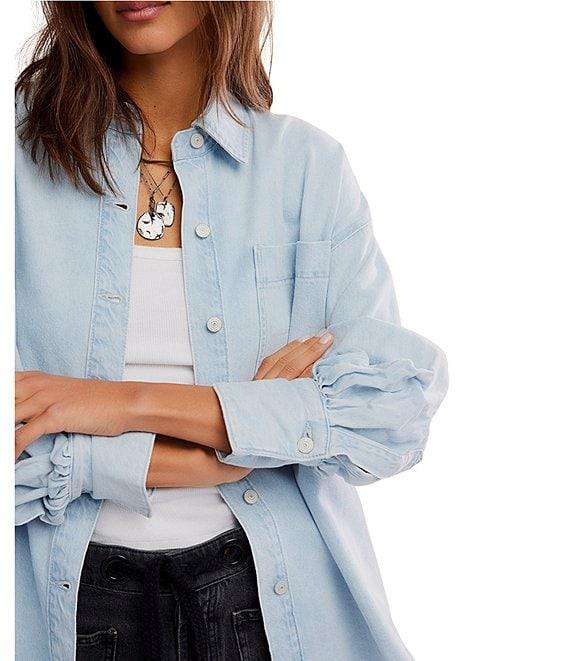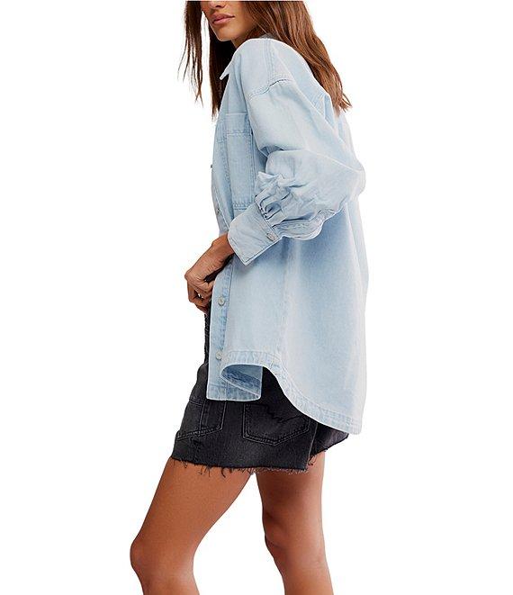 From Free people, this shirt features: Denim fabrication Oversized silhouette Point collar Drop shoulder balloon sleeves Long sleeves Front chest pocket Button front closure Approx. 29.5" Cotton Machine wash cold Imported.
