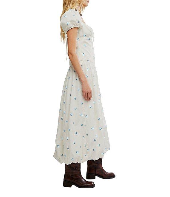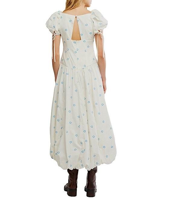 From Free People, this dress features: Allover embroidered hearts Scoop neckline Short puff sleeves Invisible back zipper closure Keyhole detail Bubble hemline Fitted drop-waist silhouette Lined Approx. 51.75" length Cotton Machine wash Imported.