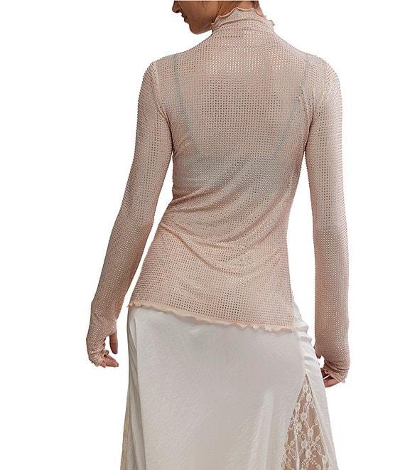 From Free People, this top features: Sheer mesh fabrication Mock neckline Long sleeves Thumb holes Rhinestone embellishments Lettuce-edge trim detail Pullover construction Polyester/spandex Hand wash Imported.