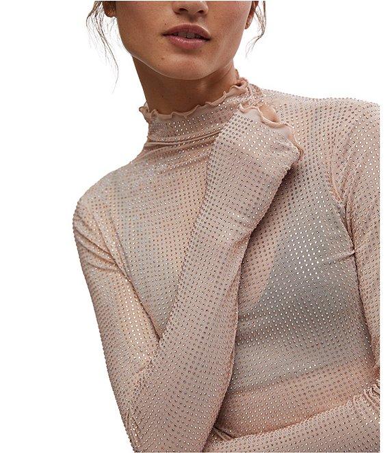 Free People Dance All Night Sheer Embellished Mesh Mock Neck Long Sleeve Fitted Top