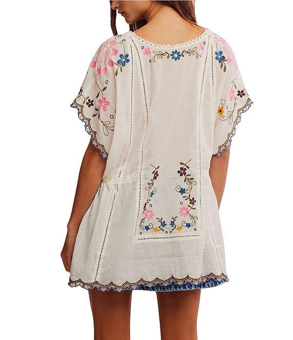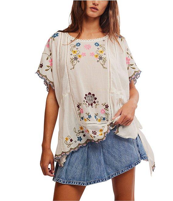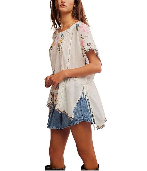 From Free People, this top features: Floral embroidery detail Scoop neckline Short sleeves Pullover construction Scalloped trim detail Tie side detail Approx. 28.5" length Cotton Machine wash Imported.
