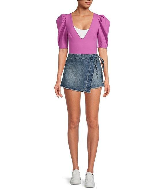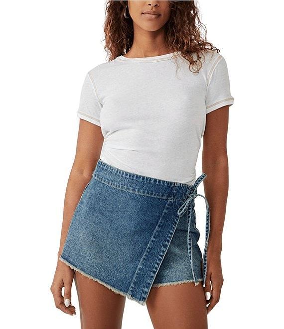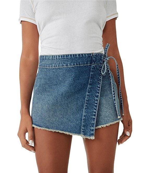 Free People Emmy Denim High Waisted Asymmetric Raw Hem Tie Side Mini Skort