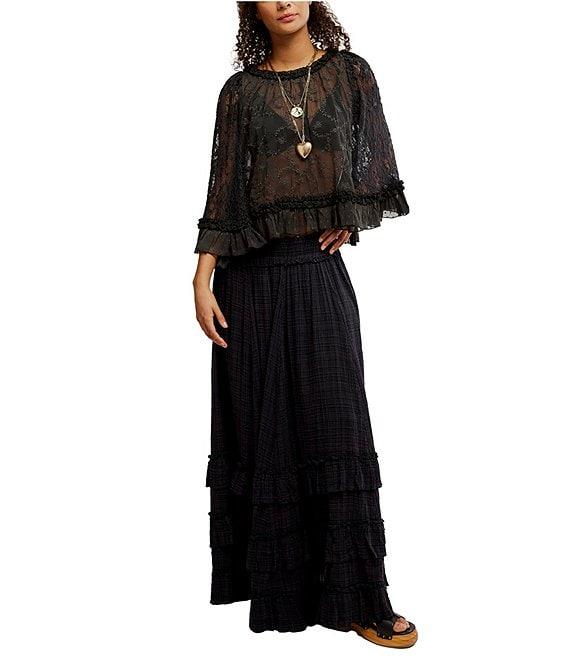 From Free People, this skirt features: Woven fabrication Mid-rise Pull-on construction Semi-sheer detail Tiered ruffle trim Approx. 40" Cotton/viscose Hand wash Imported.