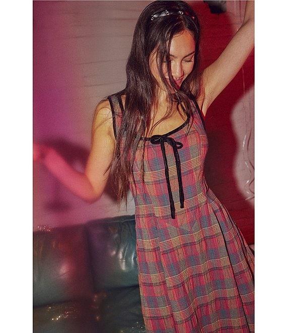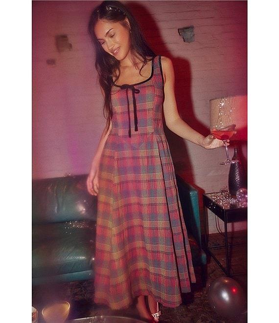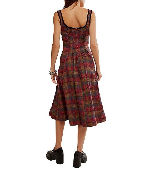 Free People Freya Plaid Print Bow Square Neck Sleeveless Midi Dress