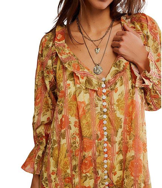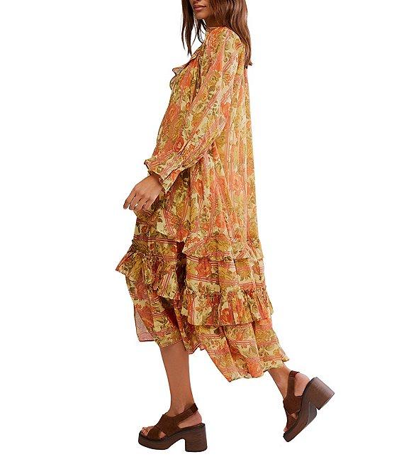 Free People Garden Wonders Ruffle V-Neck Long Sleeve Button Front Tiered Midi Dress