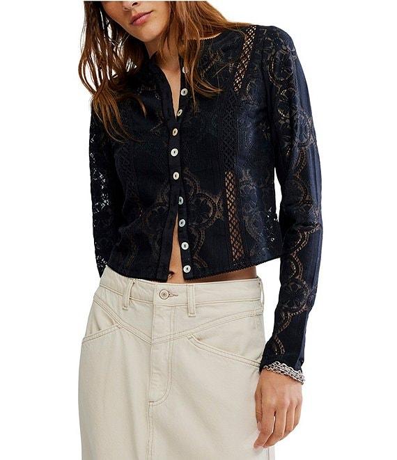 From Free People, this top features: Cotton fabrication Sheer lace detail Crew neckline Button front closure Fitted long sleeves Unlined Approx. 21.5" Cotton, Nylon, Contrast: Cotton, Elastane Hand wash cold Imported.
