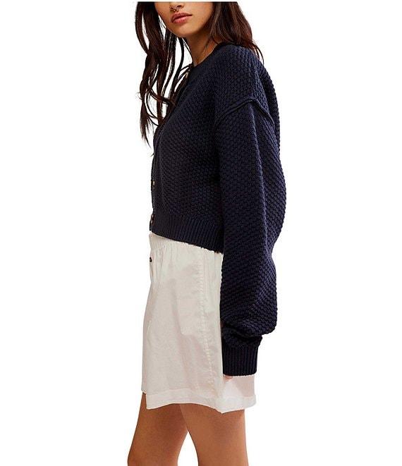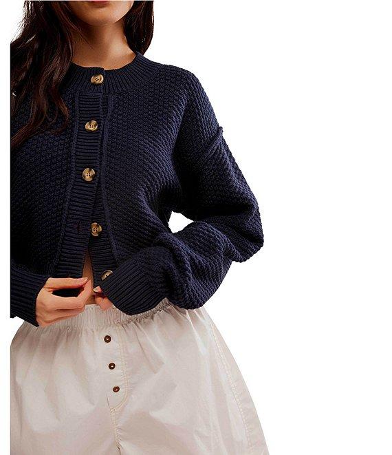 From Free People, this cardigan features: Textured knit fabrication Crew neckline Long sleeves Button front closure Ribbed hem detail Defined seaming detail Approx. 19" length Cotton/acrylic Machine wash Imported.